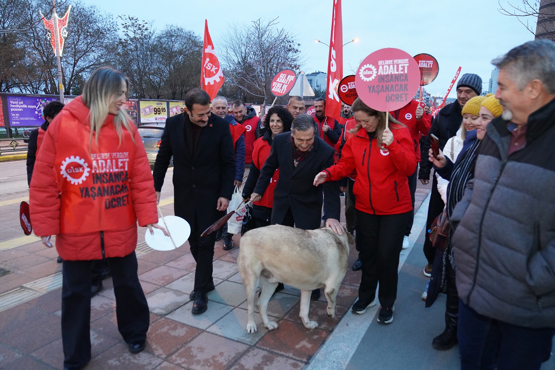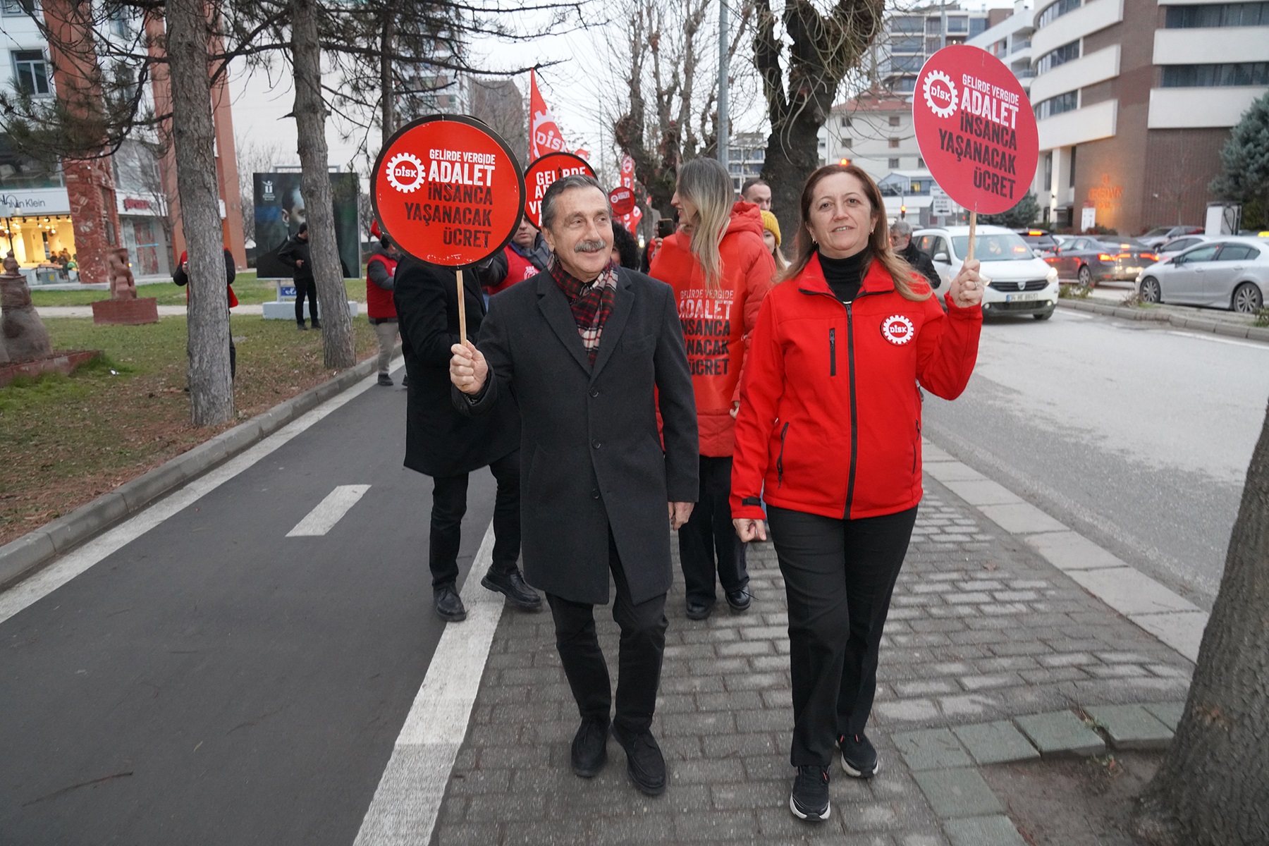 İstanbul’dan Ankara’ya insanca yaşam, gelirde ve vergide adalet talebiyle başlatılan yürüyüşün ikinci gününde Devrimci İşçi Sendikaları Konfederasyonu (DİSK) Genel Başkanı Arzu Çerkezoğlu ve sendika üyeleri Eskişehir’de basın açıklaması yaptı. Açıklama öncesinde Bursa’dan gelen DİSK üyelerini İsmet İnönü-2 Caddesi’nde karşılayan Tepebaşı Belediye başkanı Dt. Ahmet Ataç, sendika üyeleri ile birlikte Ulus Anıtı’na yürüdü. Burada gerçekleşen basın açıklamasında konuşan DİSK Genel Başkanı Arzu Çerkezoğlu, Kartal Meydanı’ndan başlayan yürüyüşün Gebze, Kocaeli ve Bursa duraklarının ardından Eskişehir’e ulaştığını belirterek “Ankara’ya gelirde adalet, vergide adalet ve ürettiğimiz değerin hakça paylaşılması için yürüyoruz. Burada bizi yalnız bırakmayan sendikalı arkadaşlarımıza, emek savunucularına, özellikle her daim yanımızda olan Başkan Ataç’a teşekkür ediyorum” dedi.