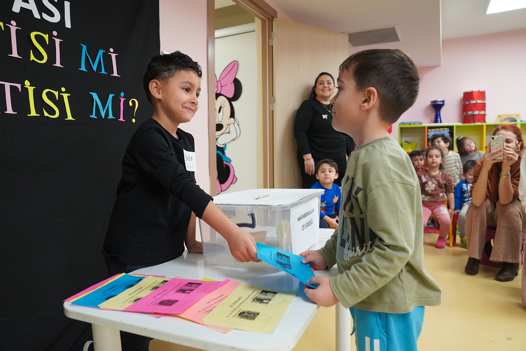 Etkinlik kapsamında, merkezde yakın zamanda düzenlenecek olan yeni yıl partisinin konseptini belirlemek için sembolik bir seçim sandığı kuruldu. Eğitmenlerinin rehberliğinde sıraya giren minikler, parti temasının saç mı yoksa makyaj mı olacağına kendi kararlarını vererek oy pusulalarına işaretledi. Ardından pusulalarını sandığa atan çocuklar, seçim sürecinin tüm aşamalarını eğlenceli bir şekilde tecrübe etti. 40 çocuğun katıldığı etkinlikte minikler; seçme-seçilme hakkı, bireysel tercih, katılım, ifade özgürlüğü gibi temel kavramlarla tanıştı. Oy verme kabinine tek tek giren çocuklar, oyunu gizli kullanma, sandığa atma ve sayım sürecine tanıklık etme gibi adımlarla demokratik kültürün temel unsurlarını yaşayarak öğrendi.