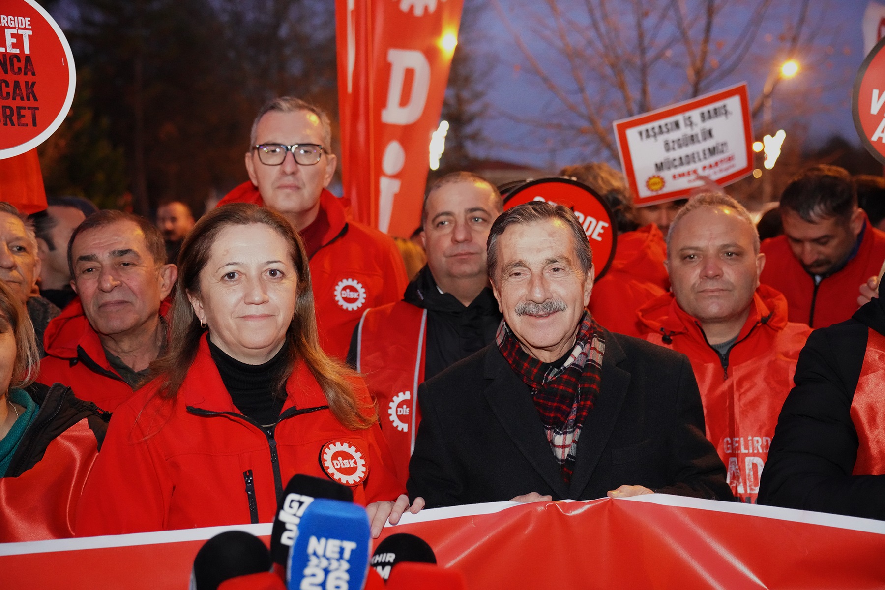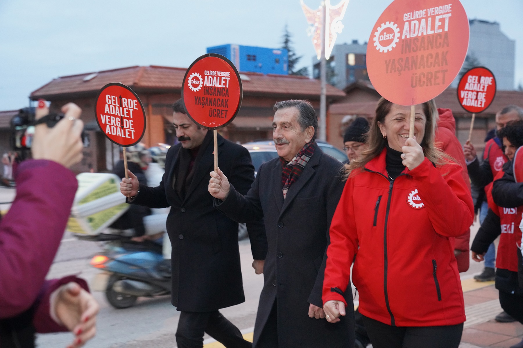 İstanbul’dan Ankara’ya insanca yaşam, gelirde ve vergide adalet talebiyle başlatılan yürüyüşün ikinci gününde Devrimci İşçi Sendikaları Konfederasyonu (DİSK) Genel Başkanı Arzu Çerkezoğlu ve sendika üyeleri Eskişehir’de basın açıklaması yaptı. Açıklama öncesinde Bursa’dan gelen DİSK üyelerini İsmet İnönü-2 Caddesi’nde karşılayan Tepebaşı Belediye başkanı Dt. Ahmet Ataç, sendika üyeleri ile birlikte Ulus Anıtı’na yürüdü. Burada gerçekleşen basın açıklamasında konuşan DİSK Genel Başkanı Arzu Çerkezoğlu, Kartal Meydanı’ndan başlayan yürüyüşün Gebze, Kocaeli ve Bursa duraklarının ardından Eskişehir’e ulaştığını belirterek “Ankara’ya gelirde adalet, vergide adalet ve ürettiğimiz değerin hakça paylaşılması için yürüyoruz. Burada bizi yalnız bırakmayan sendikalı arkadaşlarımıza, emek savunucularına, özellikle her daim yanımızda olan Başkan Ataç’a teşekkür ediyorum” dedi.