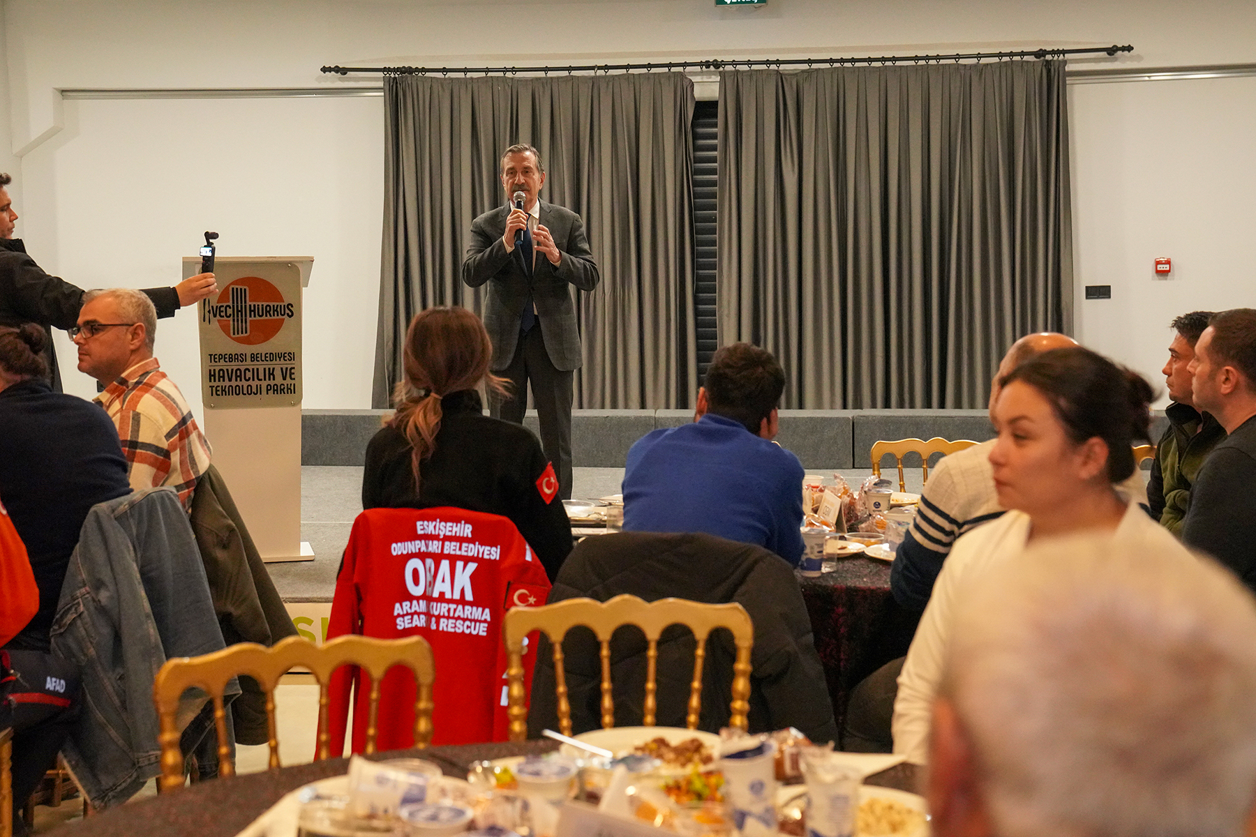 Tepebaşı Belediyesi tarafından Eskişehir’de faaliyet gösteren arama kurtarma ekiplerine yönelik düzenlenen iftar programı yoğun katılımla gerçekleştirildi. Vecihi Hürkuş Havacılık ve Teknoloji Parkı’nda gerçekleşen iftar programına Tepebaşı Belediye Başkanı Dt. Ahmet Ataç’ın yanı sıra AFAD İl Müdür Yardımcısı Zeki Aydın, Büyükşehir Belediyesi İtfaiye Daire Başkanı Dr. Mehmet Ali Çeliksoy, Tepebaşı Belediyesi başkan yardımcıları ve Eskişehir’de faaliyet gösteren 46 arama kurtarma ekipleri katıldı.