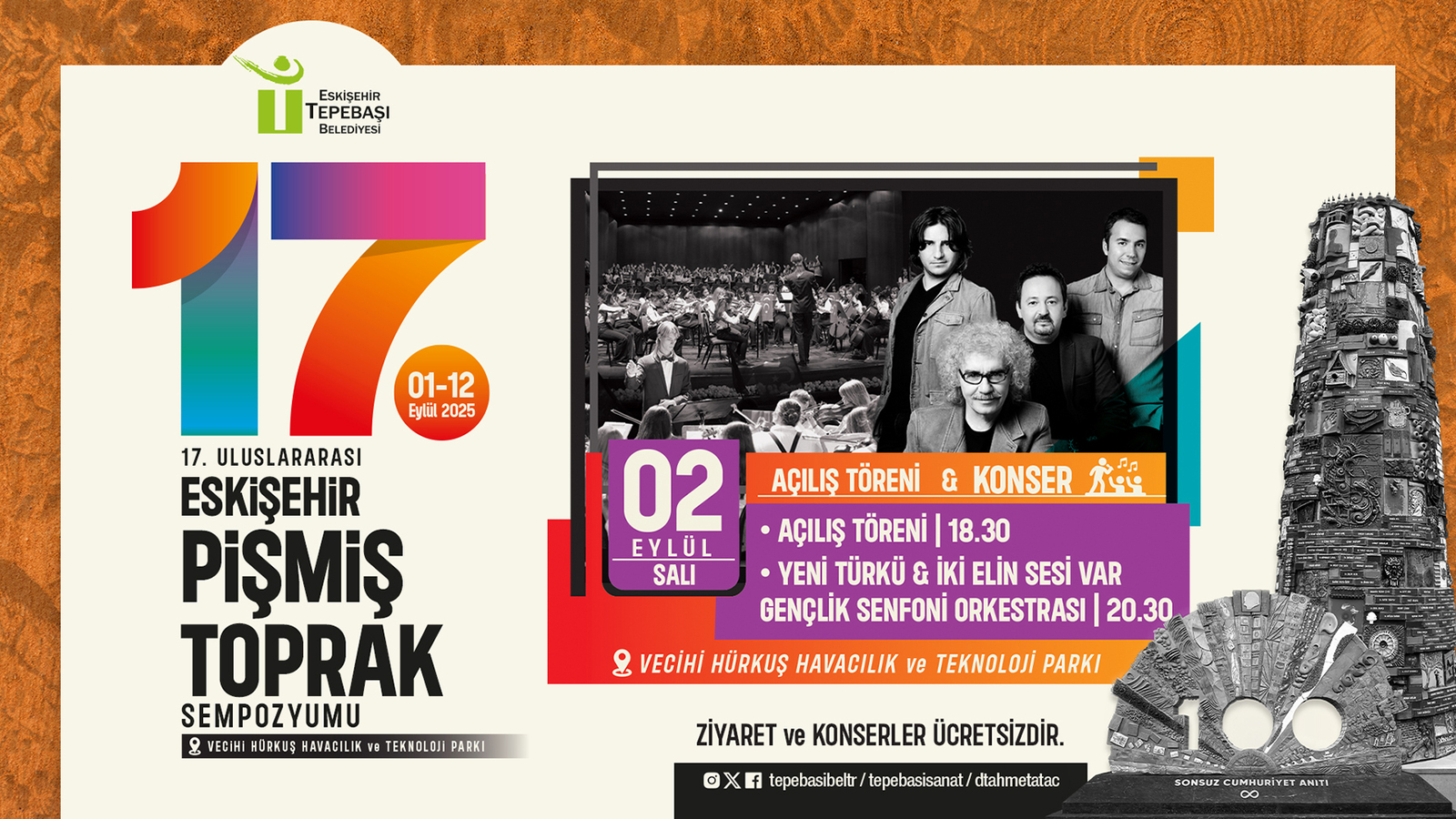Tepebaşı Belediyesi tarafından konsepti ve çeşitliliğiyle dünyada sadece Eskişehir’de düzenlenen Uluslararası Eskişehir Pişmiş Toprak Sempozyumu’nun 17’ncisi, 1-12 Eylül tarihleri arasında gerçekleştirilecek. Her yıl olduğu gibi yine birçok etkinliğe ev sahipliği yapacak olan sempozyum bu yıl da sanat etkinlikleri, sergiler, sanatçı sunumları ile dopdolu olacak. Öte yandan el emeği ürünler satış noktaları, yemek yarışmaları, konserler, çocuk atölyeleri, rekreasyon etkinlikleri ve çocuk çamur atölyeleri de Eskişehirlilere sanat dolu günler yaşatacak. Bu yılki sempozyum Manisa Büyükşehir Belediye Başkanı Ferdi Zeyrek, eski milli futbolcu ve maliye Profesörü Fethi Heper, Amigo Orhan olarak tanınan Orhan Erpek, sempozyumda 3 kez yer alan Profesör Kim Yong Moon, 12 kez sempozyuma ana sponsor olarak destek veren Başak Grup Yönetim Kurulu Başkanı Füruz Karık ve Seyitgazi’de çıkan orman yangınında hayatını kaybeden 10 şehide ithaf edildi.