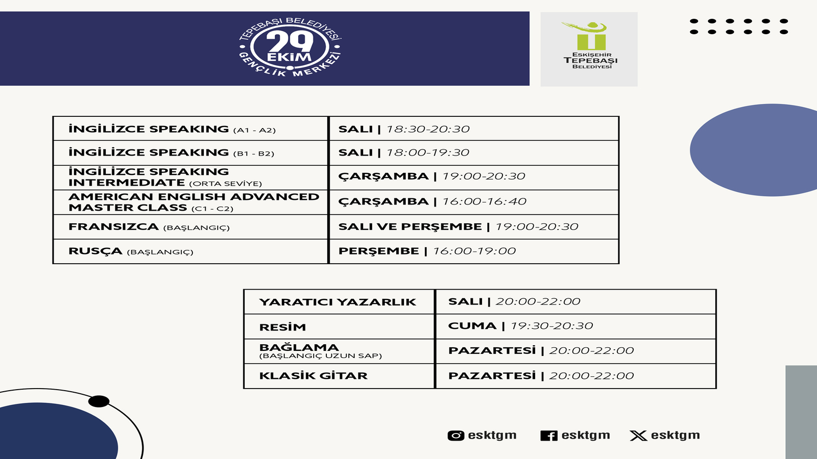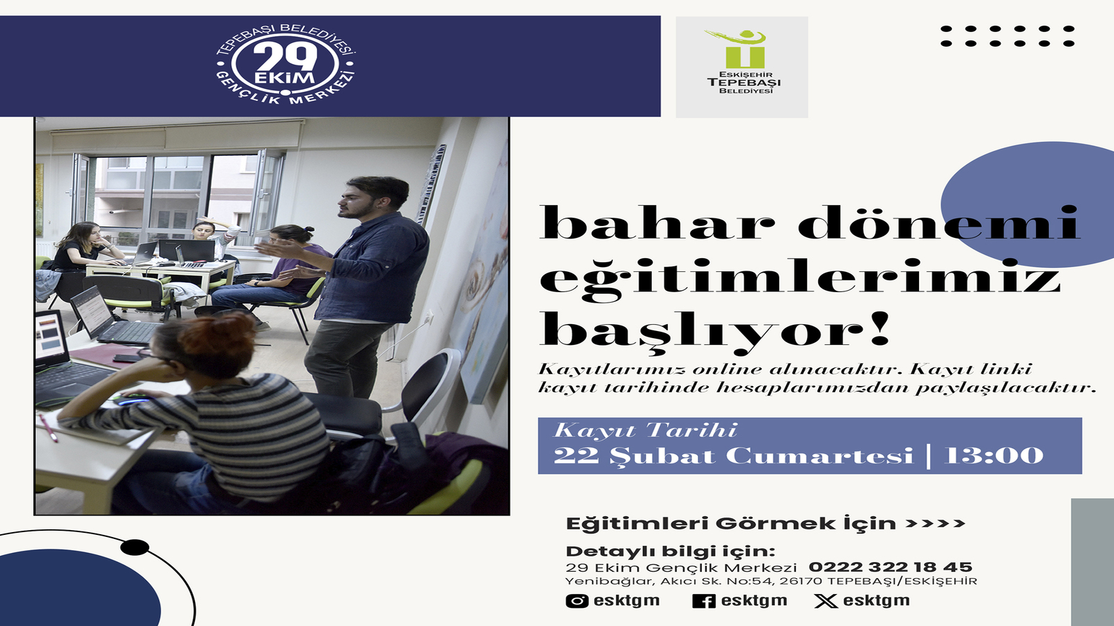Tepebaşı Belediyesi 29 Ekim Gençlik Merkezi’nde bahar dönemi eğitimleri başlıyor. Ücretsiz olarak düzenlenecek 14 farklı branştaki eğitimler için kayıtlar, online olarak 22 Şubat Cumartesi günü saat 13.00’te gerçekleştirilecek.