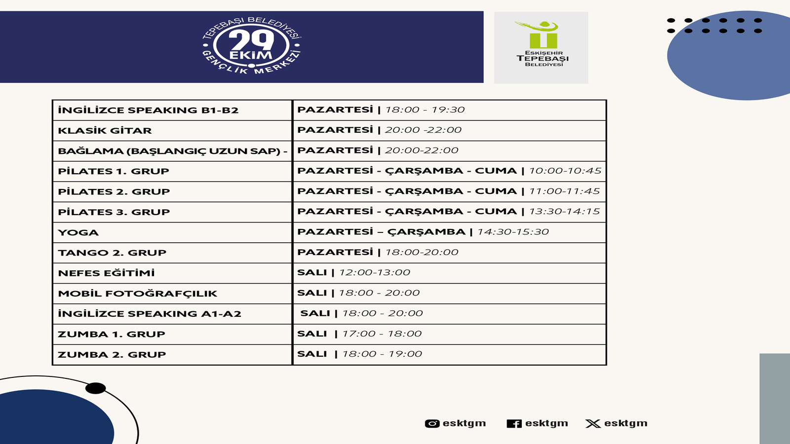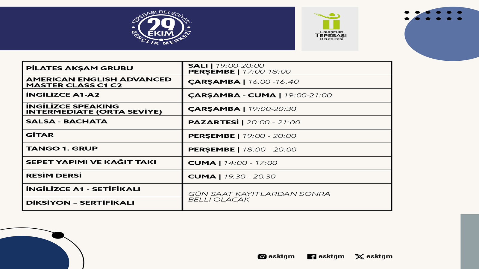 29 Ekim Gençlik Merkezi’nde gerçekleşecek eğitimler arasında; İngilizce A1-A2, İngilizce B1-B2, Klasik Gitar, Bağlama, Pilates, Yoga, Tango, Nefes Eğitimi, Mobil Fotoğrafçılık, Zumba, American English Advanced Master Class C1-C2, İngilizce Speaking İntermediate (orta seviye), Salsa-Bachata, Sepet Yapımı ve Kağıt Takı, Resim Dersi ve Diksiyon yer alıyor.