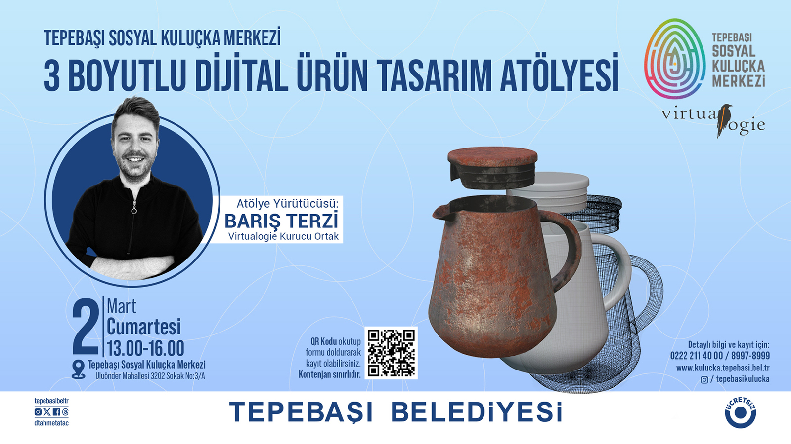 Tepebaşı Sosyal Kuluçka Merkezi sosyal girişimciler için düzenlediği etkinliklere devam ediyor. Bu kapsamda Virtualogie Tasarım Düşüncesi iş birliği ile ‘3 Boyutlu Dijital Tasarım Atölyesi’ düzenlenecek.