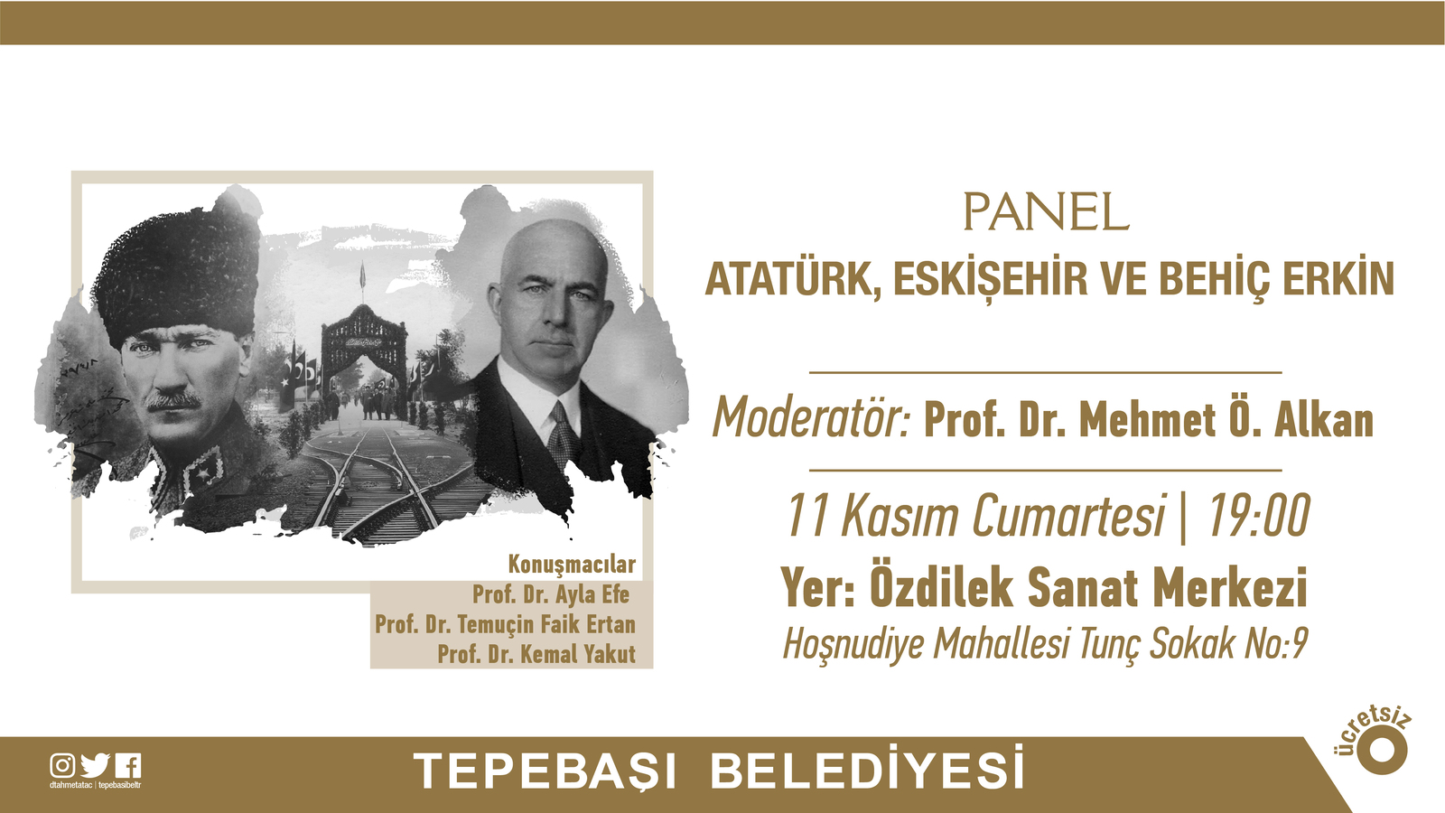 Bu kapsamda Tepebaşı Belediyesi tarafından düzenlenecek, ‘Atatürk, Eskişehir ve Behiç Erkin’ konulu panel, Eskişehirliler ile buluşacak. Özdilek Sanat Merkezi’nde gerçekleşecek ve Moderatörlüğünü Prof. Dr. Mehmet Alkan’ın yapacağı panele Prof. Dr. Ayla Efe, Prof. Dr. Temuçin Faik Ertan ve Prof. Dr. Kemal Yakut konuşmacı olarak katılacak.