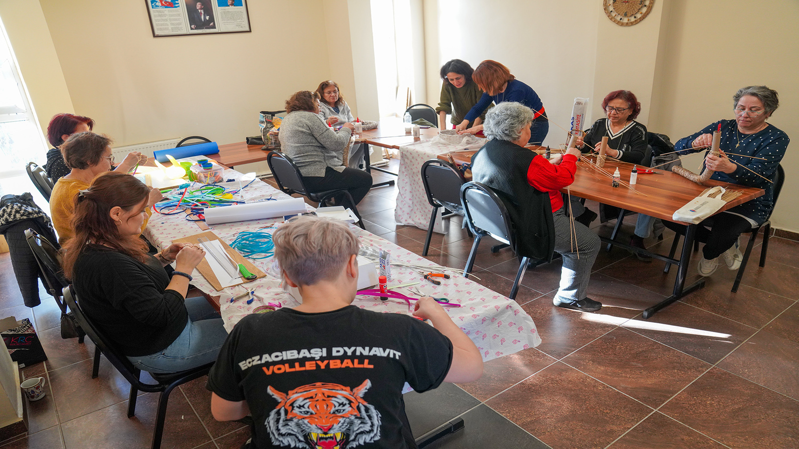 Tepebaşı Belediyesi Belde Evlerinde düzenlenen kağıt takı kursuna katılan kadınlar, kendi takılarını kağıttan yaparak hem ev ekonomilerine hem de atık kağıtları değerlendirerek ülke ekonomisine katkı sunuyorlar.