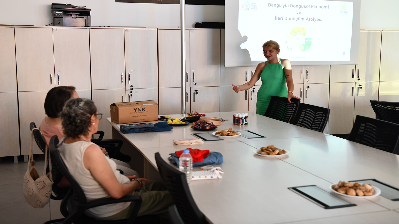 Tepebaşı Sosyal Kuluçka Merkezi’nde düzenlenen ‘Bangu’yla Döngüsel Ekonomi ve İleri Dönüşüm Atölyesi’nde katılımcılar, döngüsel ekonomi ile ilgili bilgi edinirken atık tekstil ürünlerini de ileri teknoloji tekniğiyle yeni ürünlere dönüştürmeyi öğrendi.