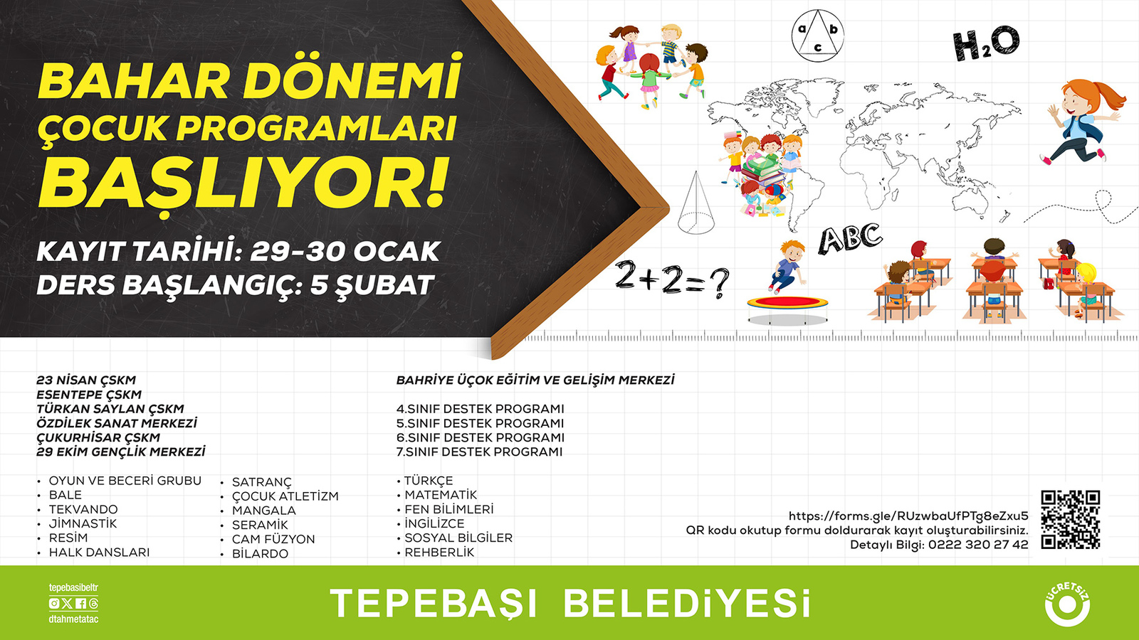 Kayıtların tamamlanmasının ardından ders başlangıç tarihi ise 5 Şubat Pazartesi günü olacak. Bahar Dönemi Çocuk Programları hakkında bilgi almak isteyen veliler, 0 222 320 27 42 numaralı telefondan yetkililere ulaşabilecek. Online kayıt formuna ise duyuru görselinde yer alan QR kodu okutarak veya http://tinyurl.com/bahardonemicocuk linkine tıklayarak ulaşılabiliyor.
