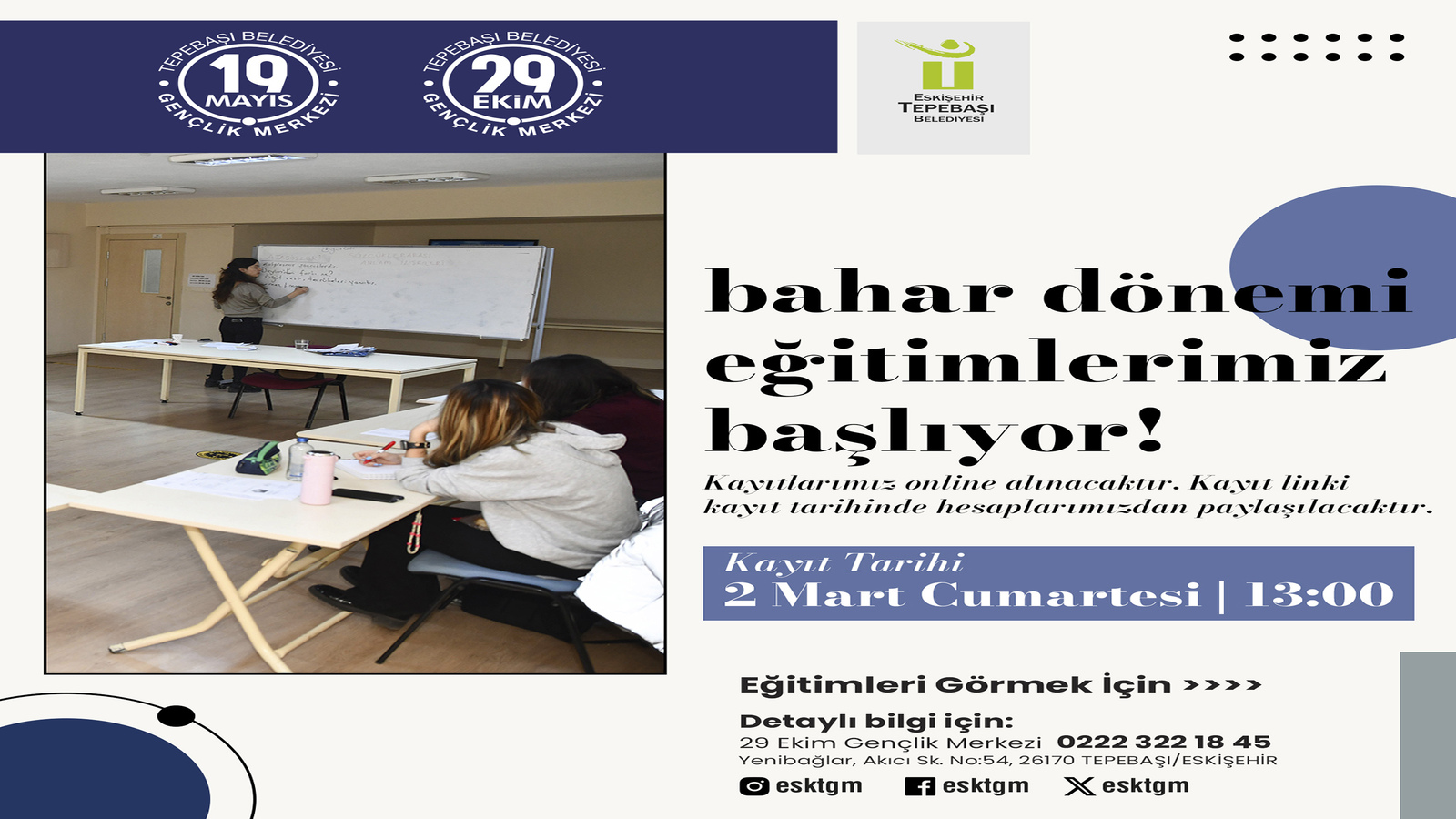 Tepebaşı Belediyesi’nin 2 farklı noktada hizmet veren Gençlik Merkezleri’nde, bahar dönemi eğitimleri başlıyor. Ücretsiz olacak 22 farklı branştaki eğitimler için kayıtlar, online olarak 2 Mart Cumartesi günü saat 13.00’te gerçekleştirilecek.