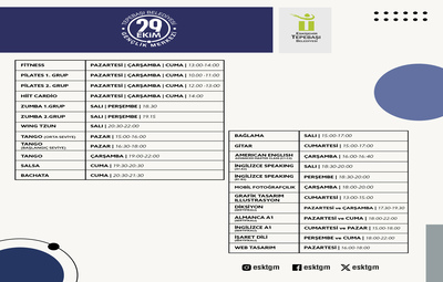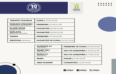 19 Mayıs Gençlik Merkezi ve 29 Ekim Gençlik Merkezi’nde gerçekleşecek eğitimler arasında; yaratıcı yazarlık, İngilizce speaking, klasik gitar, bağlama, tango, diksiyon, Almanca A1, resim, işaret dili, web tasarım, İngilizce A1, işaret dili, fitness, pilates, hit cardio, zumba, wing tzun, salsa, bachata, American English Advanced Master Class (C1-C2), İngilizce speaking (A1, A2, B1, B2), mobil fotoğrafçılık, gibi kurslar yer alıyor.