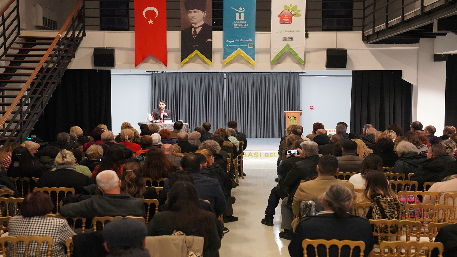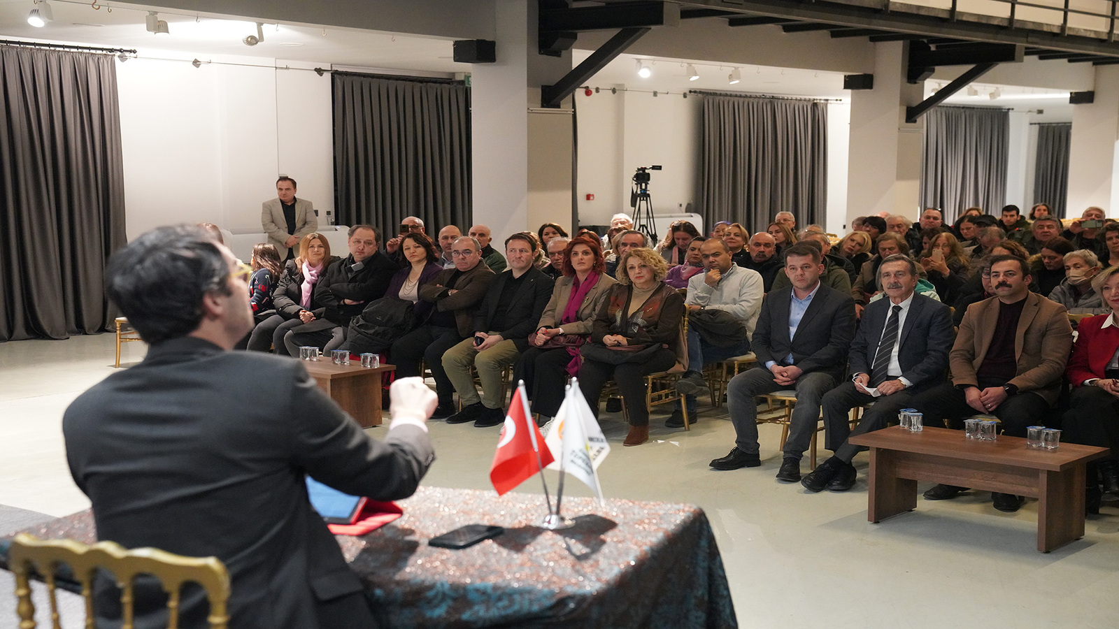 Söyleşi öncesi konuşan Tepebaşı Belediye Başkanı Ahmet Ataç, “Barış Terkoğlu ile belediyemizin bu ikinci buluşması. Eskişehir farklı bir yer. Ben kentleri fiziki yapılarıyla değil içindeki yaşayanlarla irdelenmesini severim. Eskişehir uzun zamandır erkeği ile kadınıyla yaşamasını bilen bir kenttir. Geçmiş dönemlerde de öyleydi. Ama bugün hepimiz eskileri arıyoruz. Çünkü eskiden demokrasi vardı, bağımsızlık vardı. Belki eleştirilebilir ama hukuk, adalet bundan çok daha iyiydi. Devletin taşlarıyla kimse oynamamıştı” dedi.