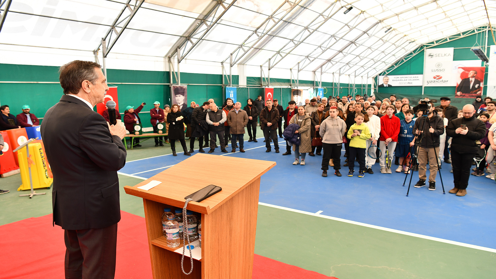 Kentte tenis alanında önemli bir eksikliği giderecek tesisin resmi açılışında konuşan Başkan Ataç, “Tenis oynadığım dönemlerde Eskişehir'in en büyük eksikliği kapalı korttu. Birtakım yerlere yapıldı ama tam ihtiyaç karşılanamadı. Başından beri bir tenis tesisini kurmak istiyordum. Çünkü Eskişehir soğuk bir iklim, 12 ay açık havada tenis oynanmıyor. Açık havada tenis oynanması da ayrı bir keyiftir. Ama antrenmanlar yapılması, maçların müsabakaların devamı için önemli olan kapalı alandı. Burası yaklaşık 3 dönüm üzerine 3 tane kort var bu çok önemli. Burası çok güzel oldu. Belki seçimden sonra gelirim, oynanmaya başlayabilirim. Tenis çok farklı bir spor. Vücudun bütün organları çalışıyor. Hedefimiz insanların sağlığı. Önemli olan spor yapan çocuklarımızın yetişmesi, Eskişehir'i dışarıda temsil etmesi en büyük idealim. Böyle bir tesise kavuştuğumuz için çok mutluyum. Daha büyük alanlarda daha çok kortu olan bir alana ihtiyacımız var. Ama burası şu anda gördüğüm kadarıyla Eskişehir'in en iyi tesisi. Ben Naim hocama ve arkadaşlarımıza çok teşekkür ediyorum. Size de teşekkür ederim” dedi.