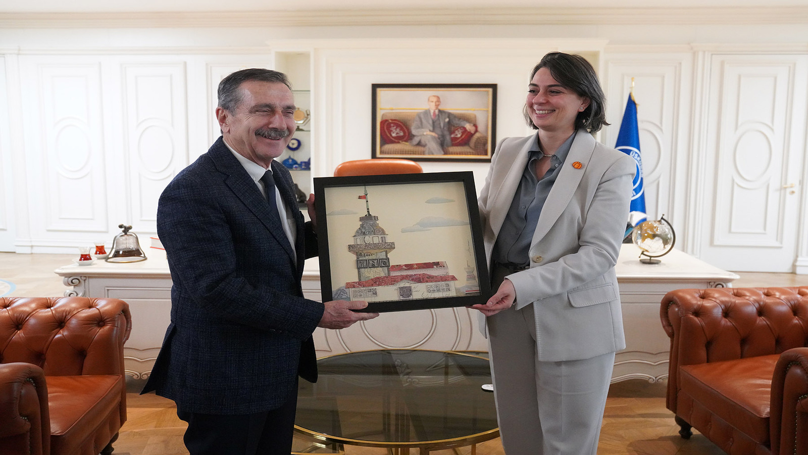 Ziyaret sonunda Başkan Dedetaş, tarihi kız kulesinin bir tablosunu Başkan Ataç’a hediye etti.