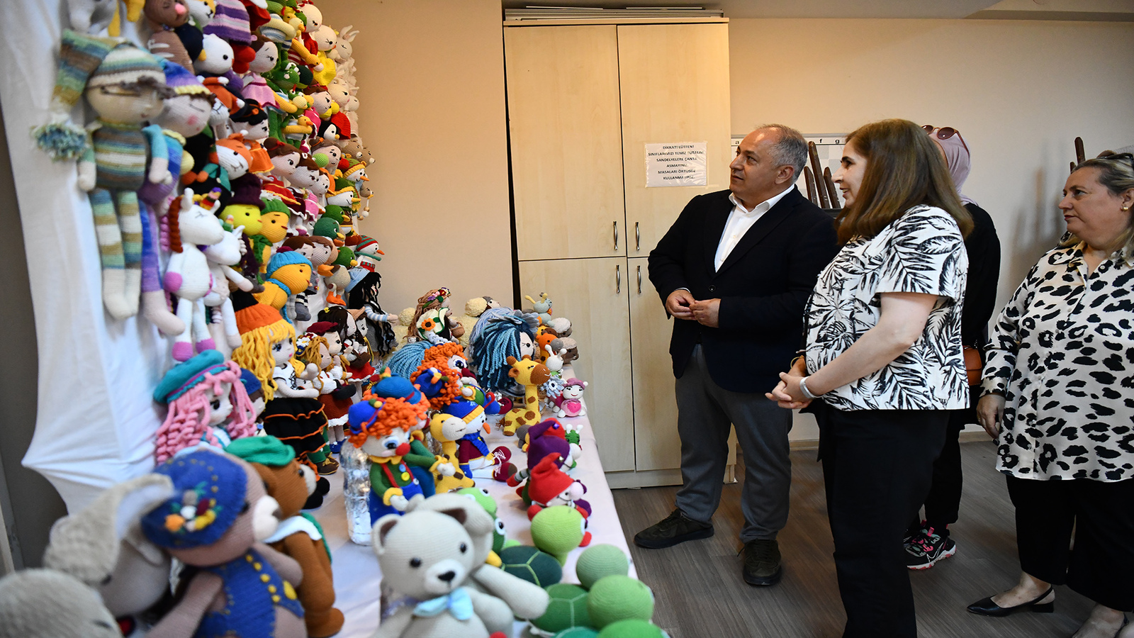 Kursiyerlerin yoğun ilgisiyle karşılanan Başkan Ataç, “İnsanların belde evlerinde yüzü gülüyor. Işık saçıyorsunuz. 24 yıldır belde evlerimiz büyük başarıyla sizlerin sayesinde devam ediyor. Nereye gitsem hangi belde evine gitsem çok güzel işler yapılmış. 24 yıl önce bunlar aklıma gelmezdi. Bugün 4 noktada sergimiz olacak ve 579 kadın bu sergilere katılıyor. Siz bu çalışmalarınızı evinize de yansıtıyorsunuz. Bu nedenle eşlerinizin de çocuklarınızın da yüzleri gülüyordur. Çünkü siz mutlu olunca evde mutluluk katlıyor. Kadının mutlu olması kadar güzel bir şey yok. Hepinize iyilikler olsun sağlıklar olsun” dedi.