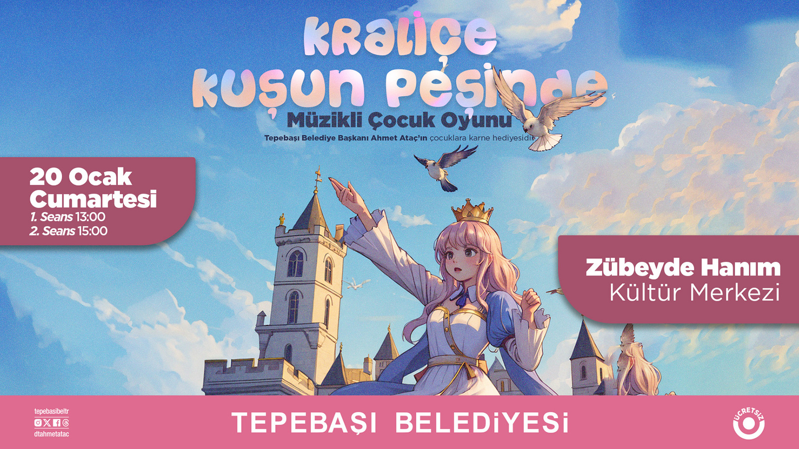 Yıl boyunca çeşitli atölye çalışmaları ile etkinlikler düzenleyen Tepebaşı Belediyesi, sömestr tatilinde de çocuklara yönelik iki ayrı oyunu ücretsiz olarak gösterime sunuyor. “Keloğlan Masalları” adlı çocuk oyunu ve “Kraliçe Kuşun Peşinde” adlı müzikal çocuk oyunu, 20 ve 21 Ocak tarihlerinde, Zübeyde Hanım Kültür Merkezi’nde Eskişehirli 4 yaş ve üzeri çocuklar ile buluşacak. “Kraliçe Kuşun Peşinde” oyunu 20 Ocak Cumartesi günü 13.00 ve 15.00 saatlerinde 2 seans olarak oynanacak. “Keloğlan Masalları” da 21 Ocak Pazar günü 12.00 ve 14.00 seanslarında çocukların beğenisine sunulacak.