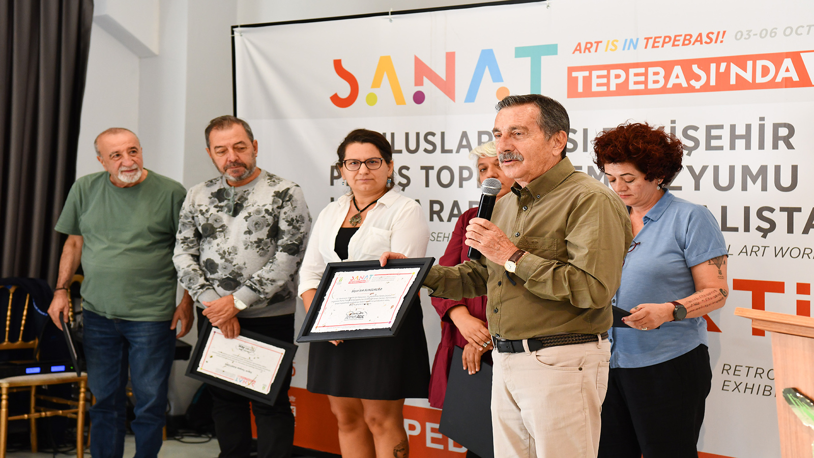Konuşmaların ardından Başkan Ataç konuk sanatçılara Tepebaşı Belediyesi Geri Dönüşüm Atölyesi’nde hazırlanan teşekkür plaketlerini takdim etti. Sanatçılar da Başkan Ataç’a sanata verdiği değerden dolayı teşekkürlerini iletti.