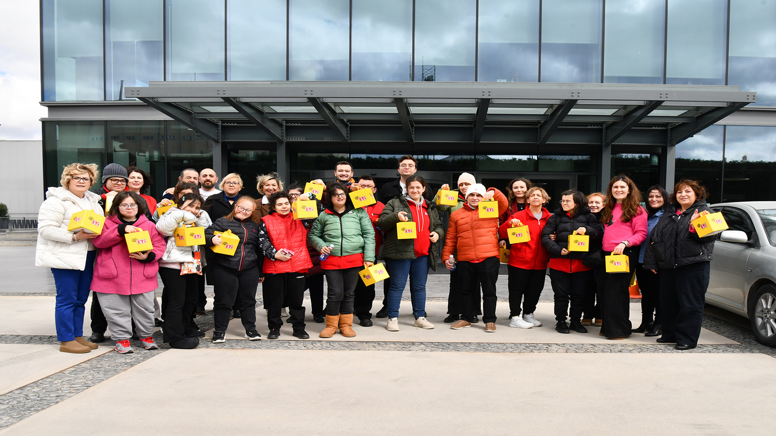 Başkan Ataç ve özel bireyler ziyarette İdari İşler Müdürü Gökçe Akyol ile Kıdemli Sosyal Hizmetler ve Yan Faydalar Uzmanı Sevgi Eğilmezbaş’la bir araya geldi. Başkan Ataç ve özel bireylere eşlik eden Akyol, ETİ’nin kuruluşundan bu yana gerçekleştirilen faaliyetler ve üretilen ürünler hakkında bilgi verdi.