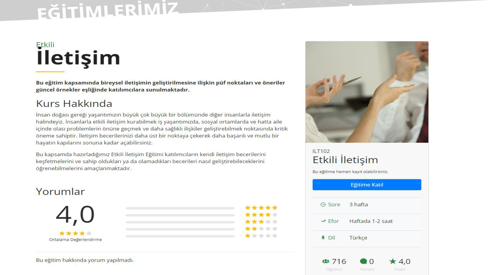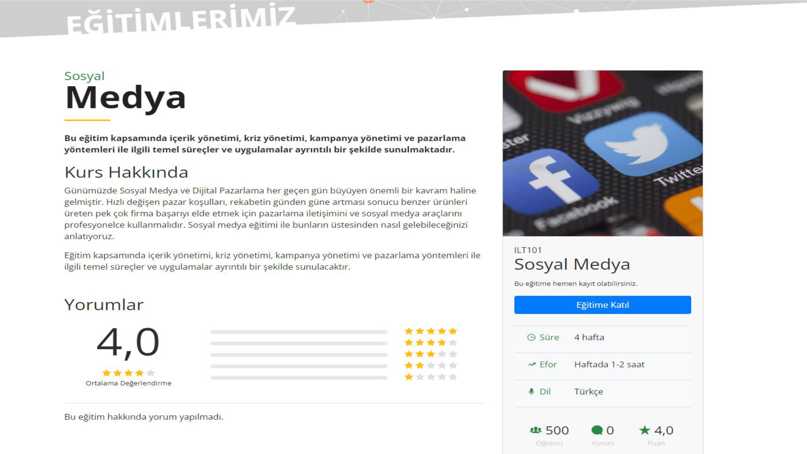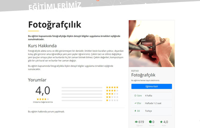 Kayıtların ve eğitimlerin devam ettiği Tepebaşı Kent Enstitüsü’nde, toplam 7 ders içeriği kullanıcılara sunuluyor. Ücretsiz olarak düzenlenen eğitimlere vatandaşların yoğun ilgi gösterirken; Girişimcilik, Sosyal Medya, Finans Okuryazarlığı, Gıda Güvenliği, Etkili İletişim, Müşteri İlişkileri ve Fotoğrafçılık branşı olmak üzere eğitimler 3 bin 719 kişinin katılımı ile devam ediyor. Derslere kayıt olmak isteyenler, ‘kentenstitusu.tepebasi.bel.tr’ web adresinden kayıt yaptırabiliyor. Derslerin içerikleri ise metin, ses, video, etkileşimli sorular, oyunlar ve benzeri medyalardan oluşuyor.