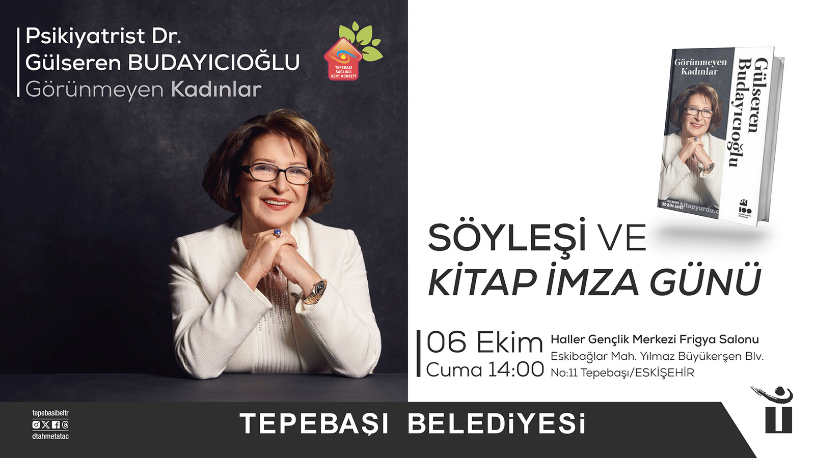 Tepebaşı Belediyesi ve Tepebaşı Sağlıklı Kent Konseyi tarafından düzenlenecek söyleşiye katılacak olan Yazar Psikiyatr Dr. Gülseren Budayıcıoğlu, son yayınlanan kitabı ‘Görünmeyen Kadınlar’ı anlatacak. Budayıcıoğlu, söyleşinin ardından ise hayranları için kitabını imzalayacak.