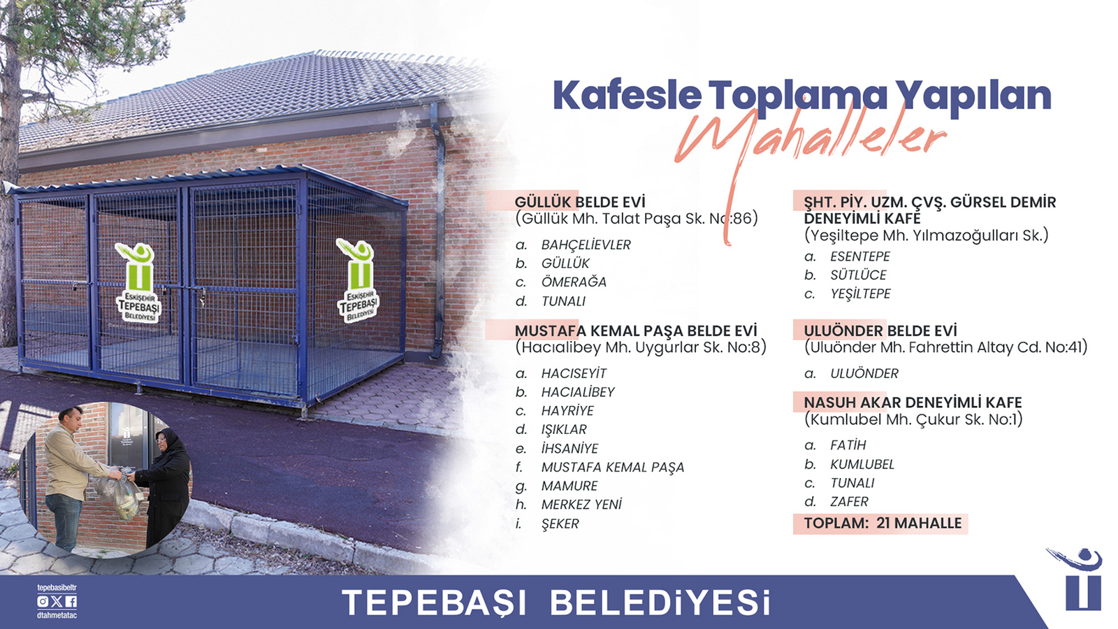“El Birliğiyle Temiz Çevre Temiz Tepebaşı” sloganıyla hayata geçirilen toplama noktaları; Bahçelievler, Güllük, Ömerağa, Tunalı mahalleleri Güllük Belde Evi’nde, Hacı Seyit, Hacıalibey, Hayriye, Işıklar, İhsaniye, Mustafa Kemal Paşa, Mamure, Merkez Yeni ve Şeker mahalleleri Mustafa Kemal Paşa Belde Evi’nde, Esentepe, Sütlüce ve Yeşiltepe mahalleleri Şehit Piyade Uzman Çavuş Gürsel Demir Deneyimli Kafe’de, Uluönder Mahallesi Uluönder Belde Evi’nde, Fatih, Kumlubel, Tunalı ve Zafer mahalleleri de Nasuh Akar Deneyimli Kafe’de oluşturulan alana bırakabilecek. 5 farklı yere yerleştirilen atık toplama noktaları 21 mahalleye hizmet veriyor. Vatandaşlar ambalaj atıklarını, belirtilen noktalardaki deneyimli kafelere (Salı günleri hariç) ve belde evlerine ise her gün saat 08.00-17.00 saatleri arasında getirebiliyor.