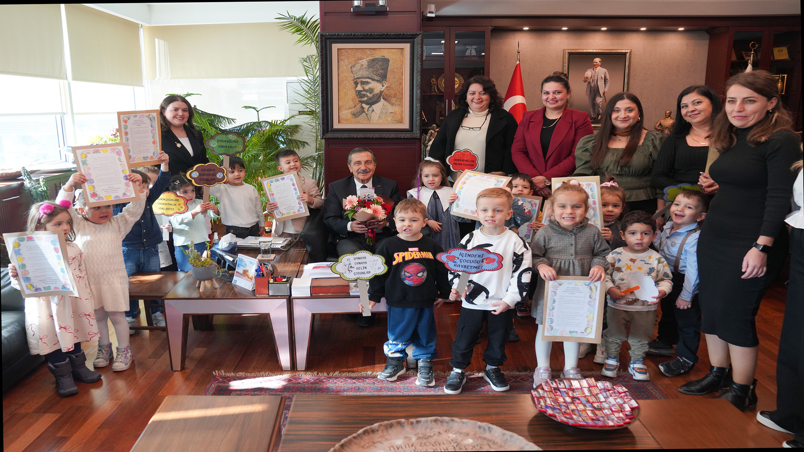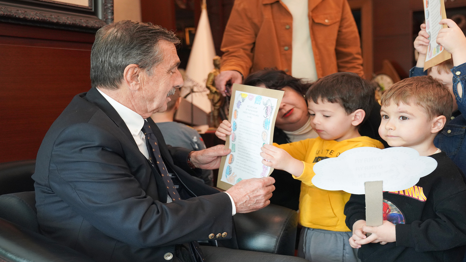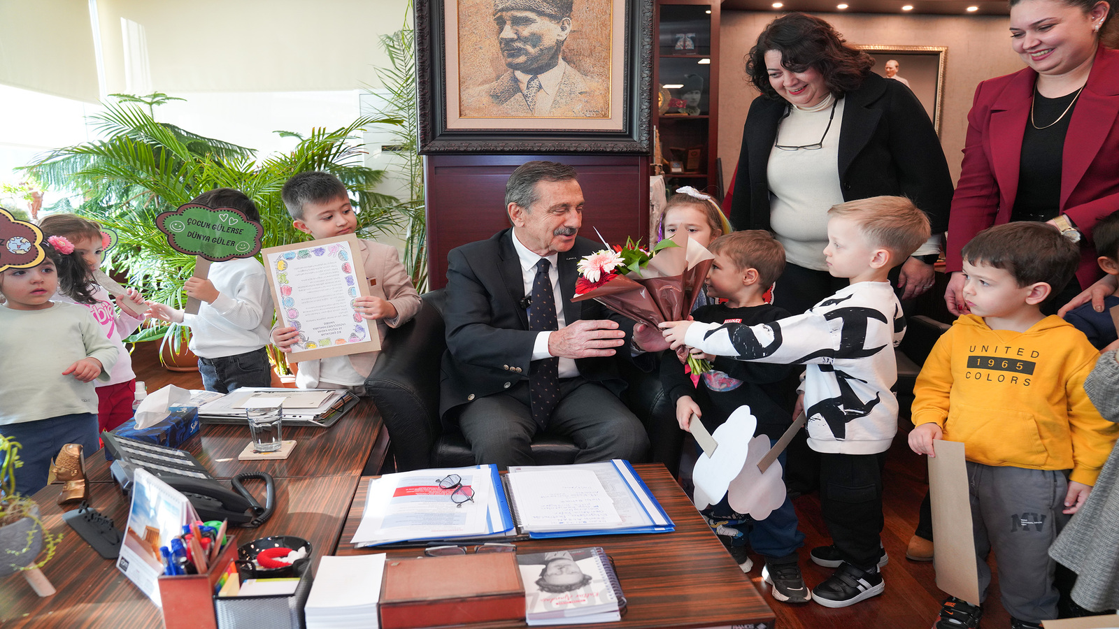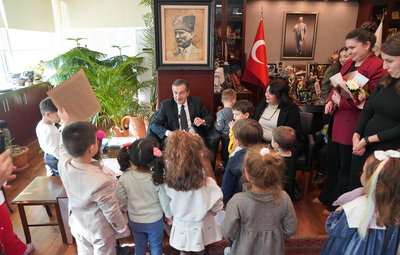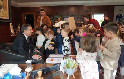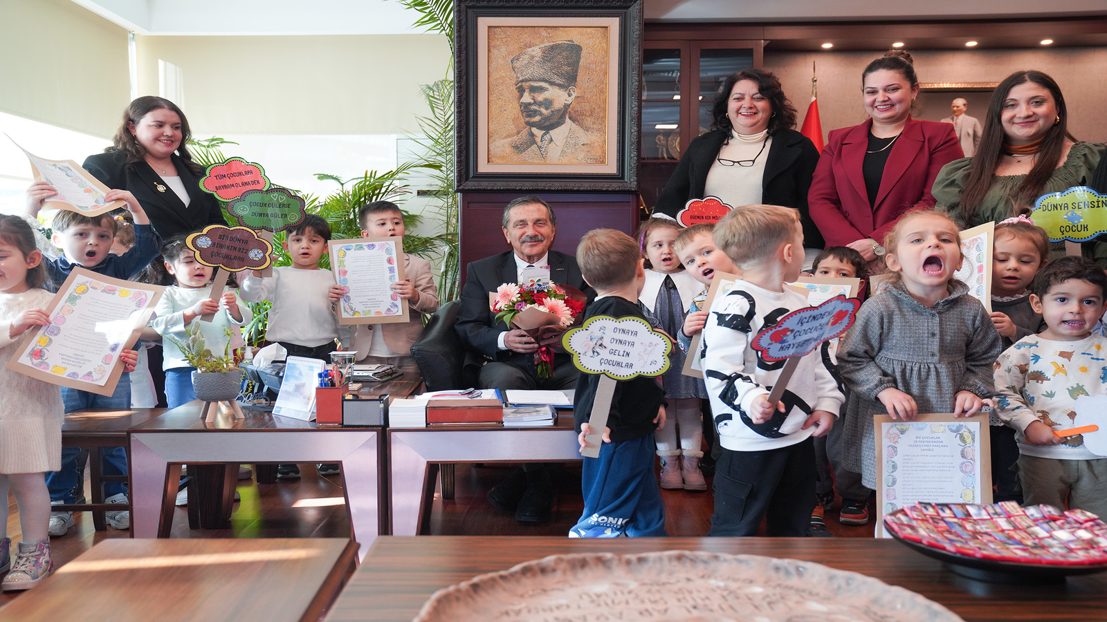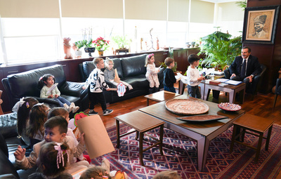 Tepebaşı Belediyesi Sabiha Gökçen Erken Çocukluk Oyun Merkezi öğrencileri, Dünya Çocuk Hakları Günü’nde Başkan Ataç’ı ziyaret ederek, hazırladıkları pankartları gösterdiler.