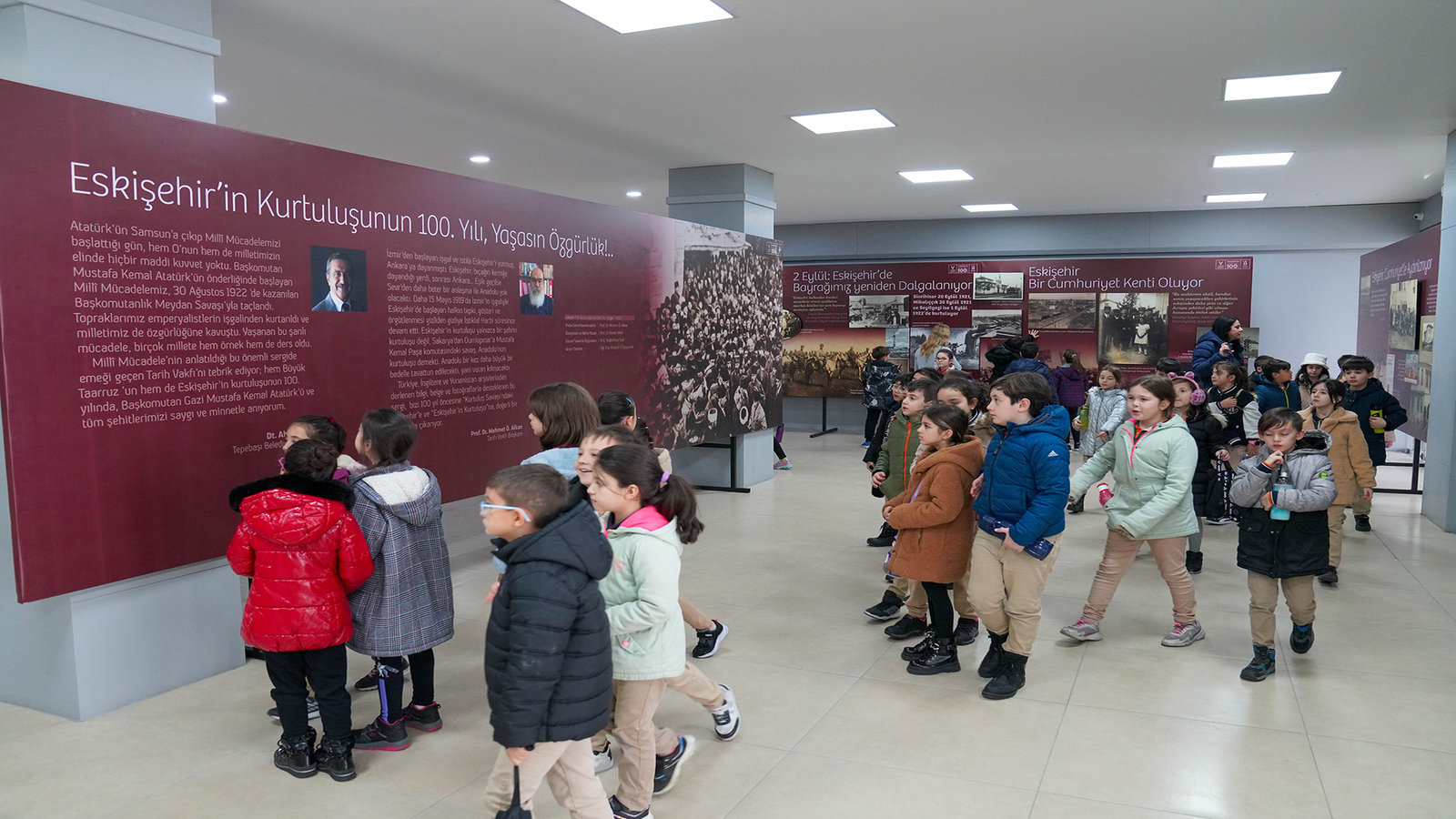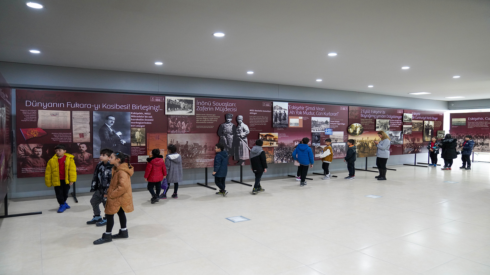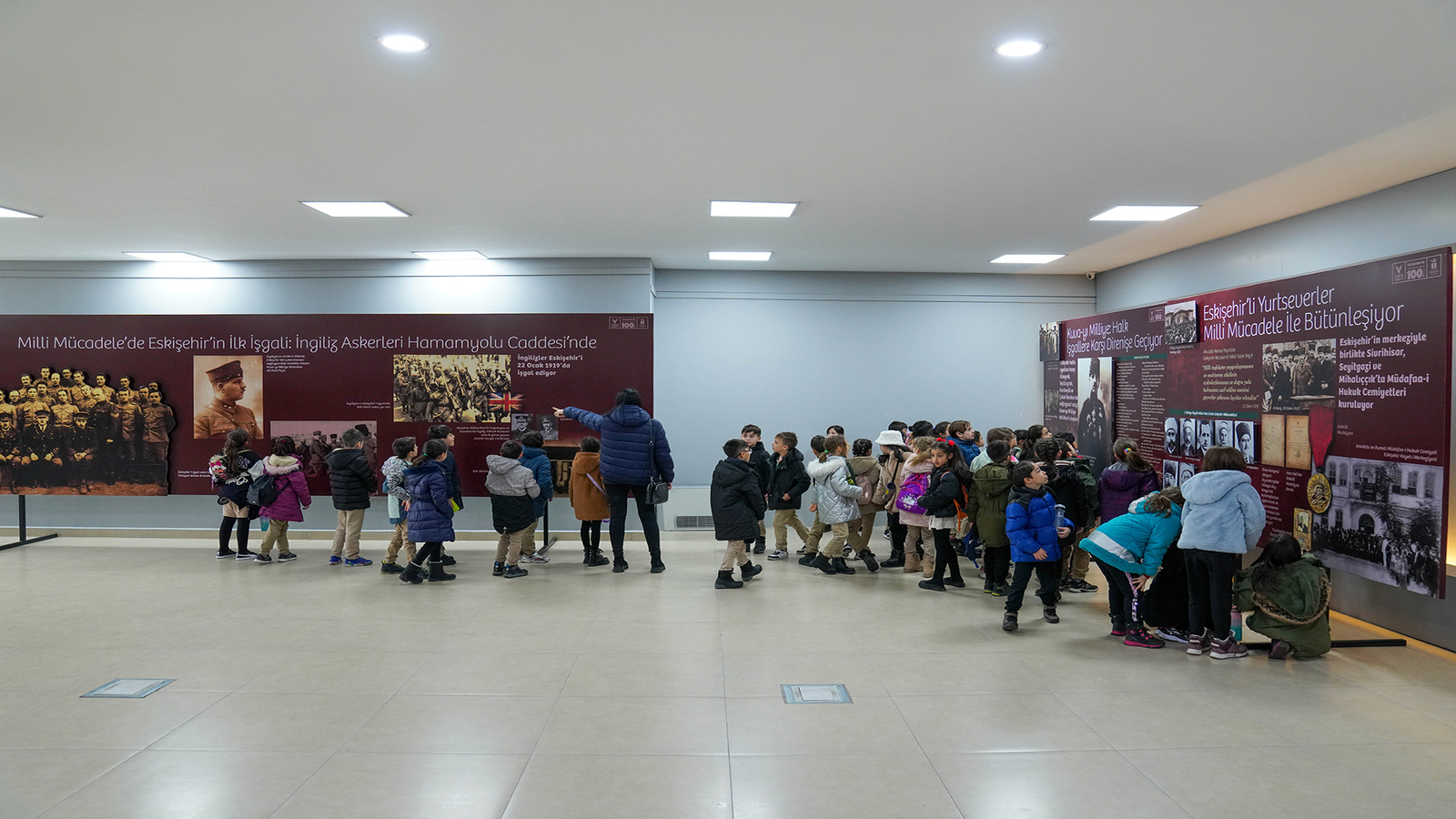 Milli Mücadele’de Eskişehir ve 100. Yılında Eskişehir’in Kurtuluşu sergisi, Eskişehir’in uğradığı işgallerden verilen mücadelelere, Mustafa Kemal Atatürk’ün Eskişehir’e ilişkin tespitlerinden İnönü Savaşları’na kadar pek çok tarihi olayı, görsel zenginlikler ile ziyaretçilerine anlatıyor. Milli İrade İlkokulu 3. Sınıf öğrencileri, sergiyi gezerek dönemi anlatan görselleri ve belgeleri görme şansı buldu.