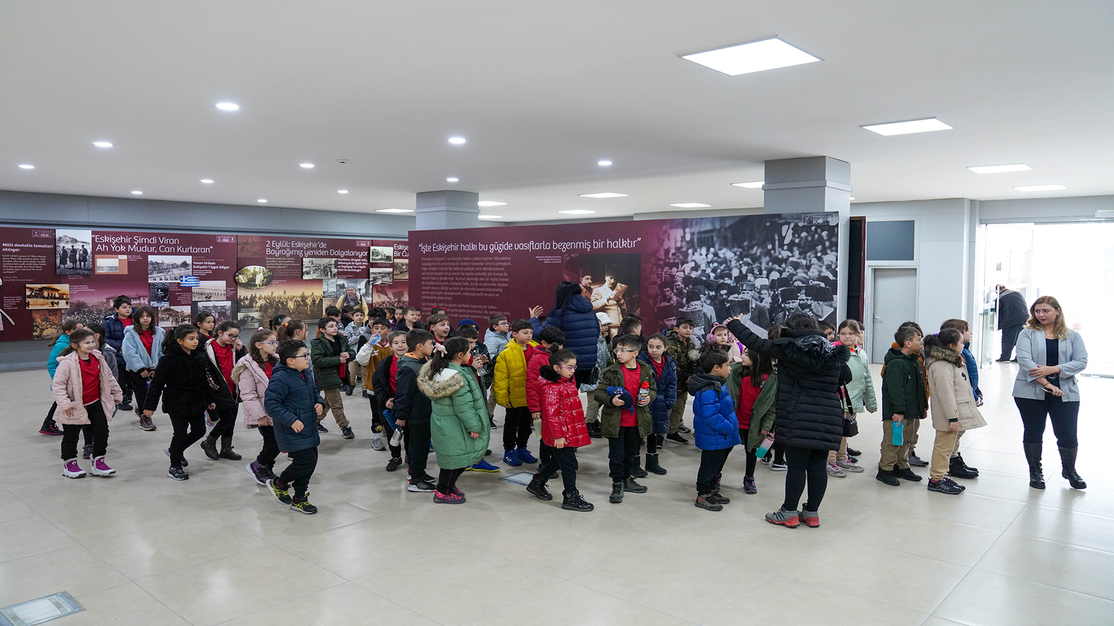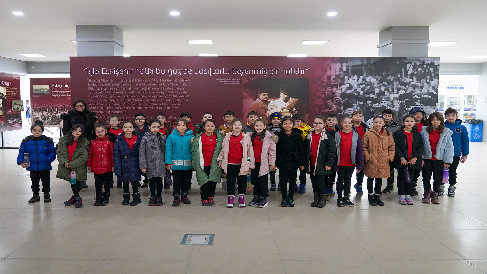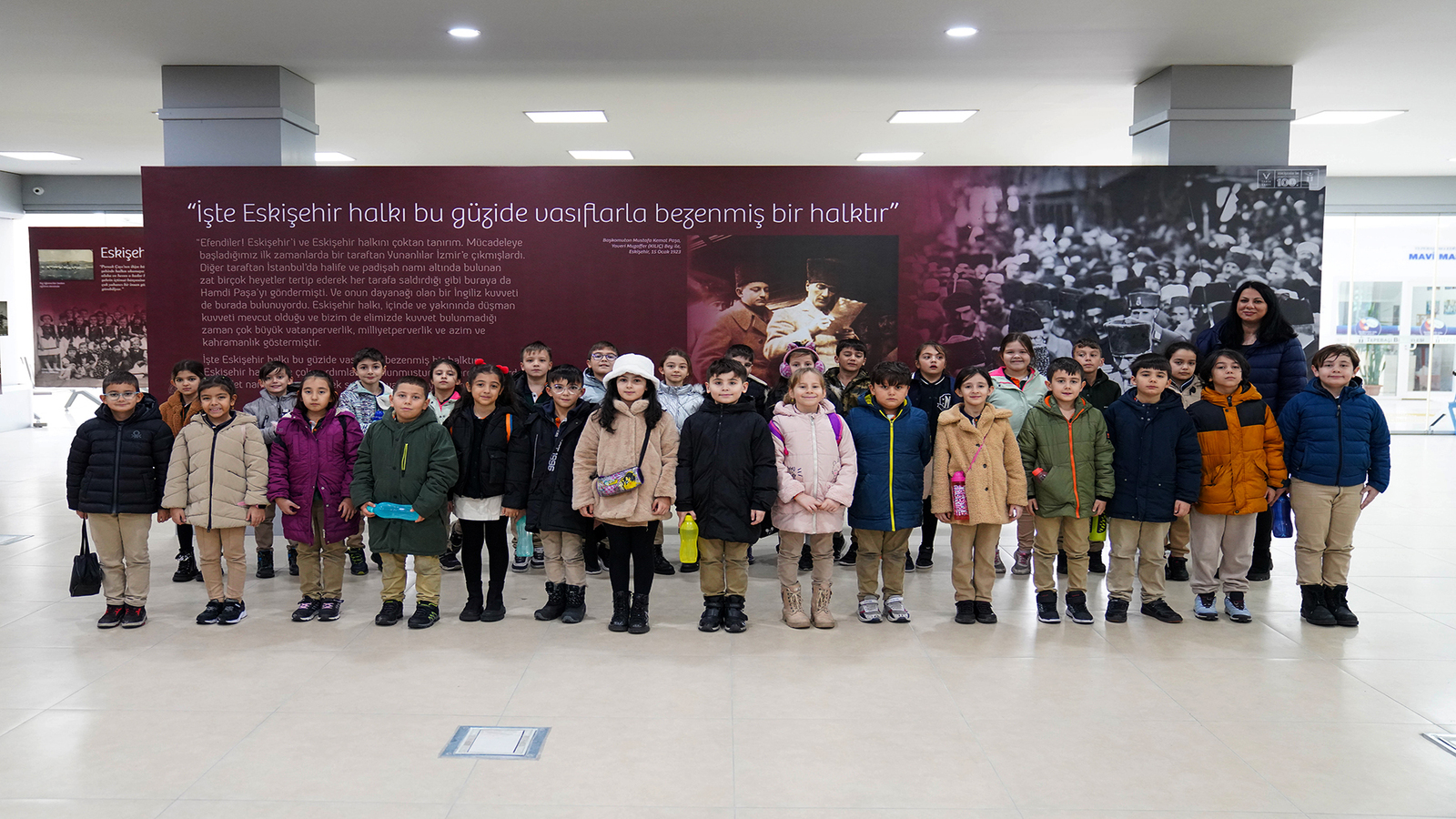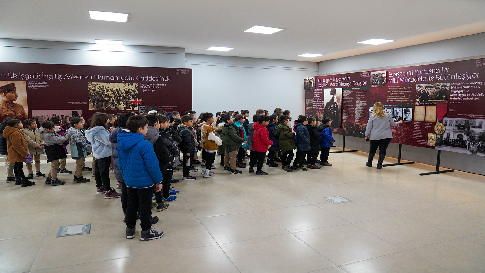 Milli Mücadele’de Eskişehir ve 100. Yılında Eskişehir’in Kurtuluşu sergisi, Eskişehir’in uğradığı işgallerden verilen mücadelelere, Mustafa Kemal Atatürk’ün Eskişehir’e ilişkin tespitlerinden İnönü Savaşları’na kadar pek çok tarihi olayı, görsel zenginlikler ile ziyaretçilerine anlatıyor. Milli İrade İlkokulu 3. Sınıf öğrencileri, sergiyi gezerek dönemi anlatan görselleri ve belgeleri görme şansı buldu.