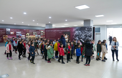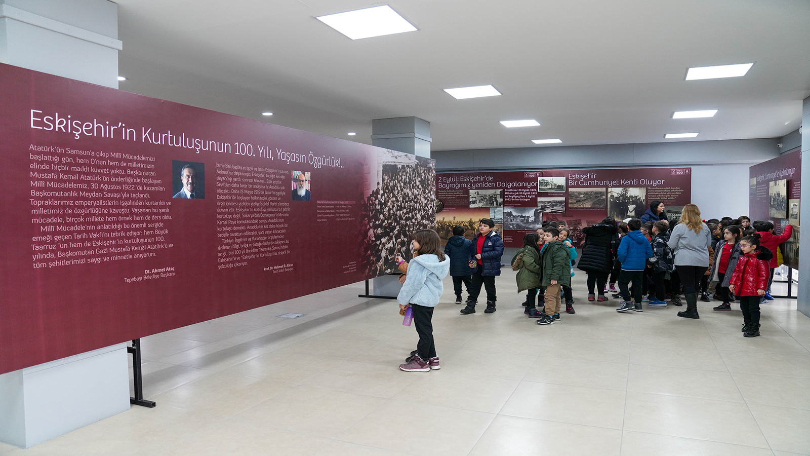 Tepebaşı Belediyesi’nin “Milli Mücadele’de Eskişehir ve 100. Yılında Eskişehir’in Kurtuluşu” sergisini ziyaret eden öğrenciler, Eskişehir’in kurtuluşunu öğreniyor.