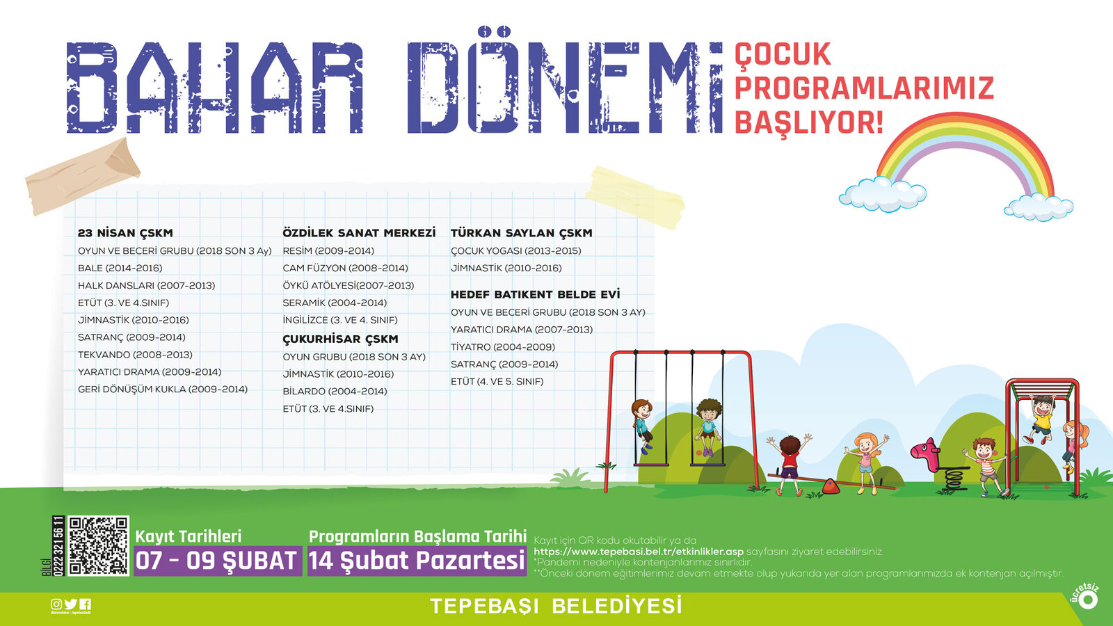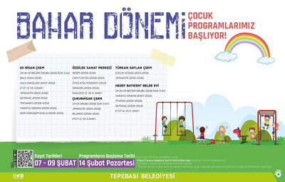 Bahar Dönemi Çocuk Programları hakkında bilgi almak isteyen vatandaşlar, 0 (222) 211 40 00 (4200-4205) numaralı telefonlardan yetkililere ulaşabiliyor. Online kayıt formuna ise Tepebaşı Belediyesi’nin “www.tepebasi.bel.tr” web adresindeki etkinlikler sayfasında bulunan QR kod üzerinden ulaşılabiliyor.