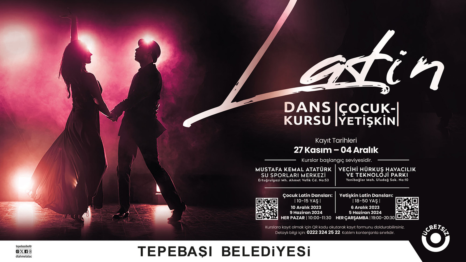 Kurslara kayıt yaptırmak isteyenler, duyuru afişinde yer alan QR Kod üzerinden veya çocuklar için https://tinyurl.com/cocuklatin yetişkinler için de https://tinyurl.com/latinkurs linklerine tıklayarak kayıt formuna ulaşabilecek.