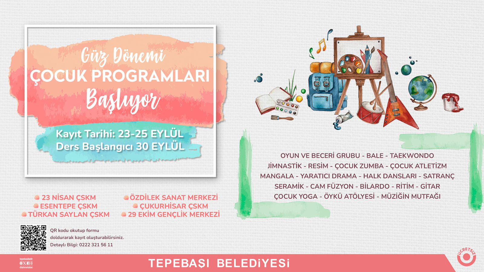 29 Ekim Gençlik Merkezi ve Çocuk Sanat ve Kültür Merkezlerinde düzenlenecek güz dönemi çocuk programları hakkında bilgi almak isteyen vatandaşlar, 0 (222) 321 56 11 numaralı telefonlardan yetkililere ulaşabiliyor. Online kayıt formuna ise görselde yer alan QR kodu okutarak veya https://tinyurl.com/cocukguzdonemi linkine tıklayarak ulaşılabiliyor.