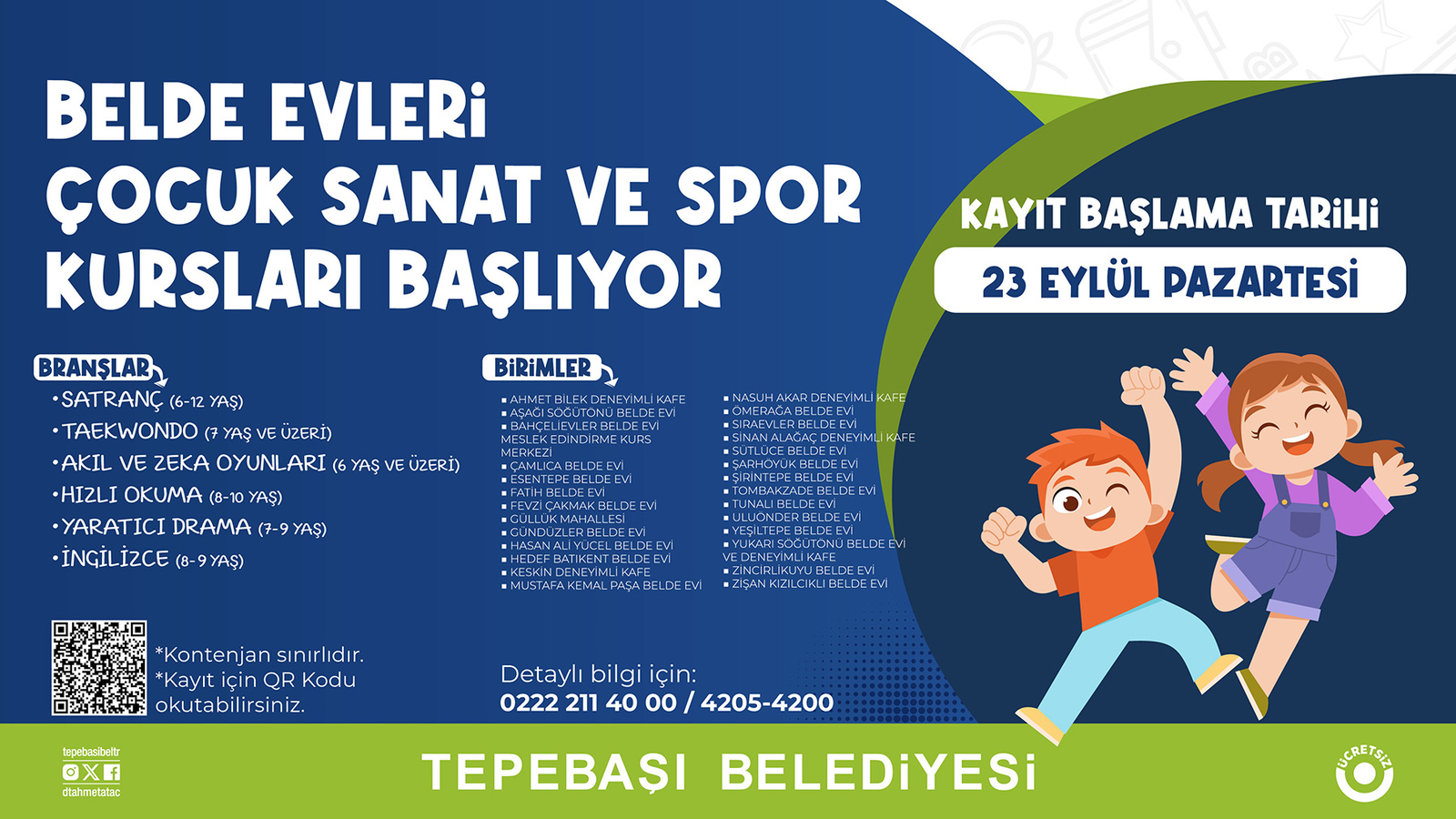 Tepebaşı Belediyesi bünyesindeki Belde Evleri ve Deneyimli Kafeler olmak üzere 27 farklı noktada düzenlenecek çocuk sanat ve spor kursları için de kayıtlar online gerçekleştirilecek. 6-12 yaş arası çocuklar için düzenlenecek kurslar arasında satranç (6-12 yaş), tekvando (7 yaş ve üzeri), Akıl ve zeka oyunları (6 yaş ve üzeri), hızlı okuma (8-10 yaş), yaratıcı drama (7-9 yaş) ve İngilizce (8-9 yaş) yer alıyor.
