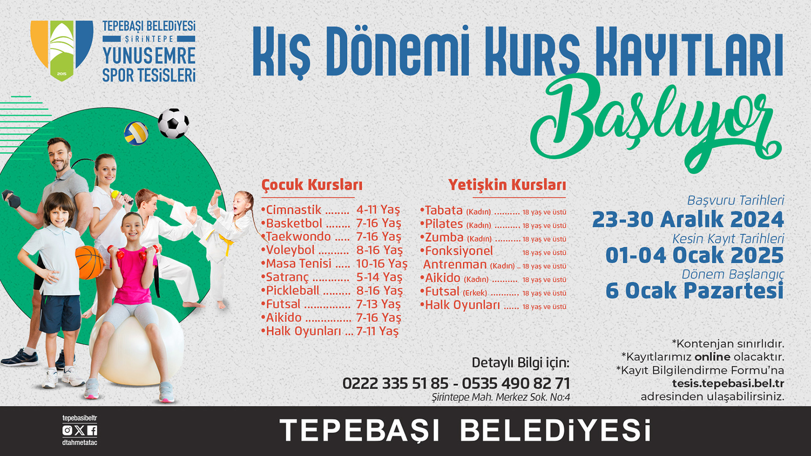 Tepebaşı Belediyesi tarafından Şirintepe Mahallesi'nde hizmete girdiği günden bu yana Eskişehirlilerin vazgeçilmezi haline gelen Yunus Emre Spor Tesisleri’nde gerçekleştirilecek kurslar kapsamında hem yetişkinler hem de çocuklara yönelik eğitimler yer alıyor. 4-11 yaş arası çocuklar için jimnastik, 7-16 yaş arası basketbol, tekvando ve aikido, 8-16 yaş arası voleybol ve pickleball, 10-16 yaş arası masa tenisi, 5-14 yaş arası satranç, 7-13 yaş arası futsal ile 7-11 yaş arası için de halk oyunları kursları düzenlenecek. Yine uzman eğitmenler tarafından 18 yaş üstü yetişkinler için ise tabata, pilates, zumba, fonksiyonel antrenman, aikido, halk oyunları ve futsal kursları verilecek.
