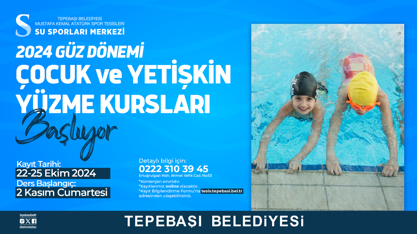 Tepebaşı Belediyesi Mustafa Kemal Atatürk Spor Tesisleri Su Sporları Merkezi’nde 2024 Güz Dönemi Çocuk ve Yetişkin Yüzme Kursları başlıyor. Kurs programından yararlanmak için kayıt tarihleri 22-25 Ekim olarak belirlendi.