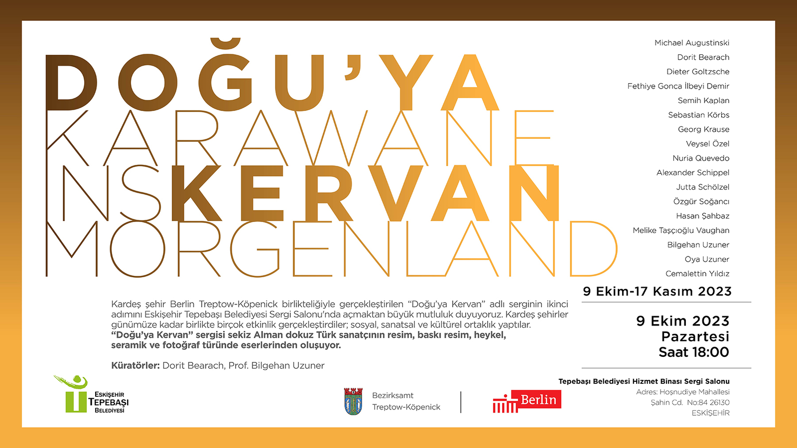 2017 yılından itibaren Tepebaşı Belediyesi’nin kardeş şehri olan Berlin Treptow-Köpecik Belediyesi ile sosyal, sanatsal ve kültürel anlamda yapılan çalışmalara bir yenisi daha ekleniyor. 8’i Alman, 9’u Türk olmak üzere 17 sanatçının hazırlamış olduğu ‘Doğu’ya Kervan’ isimli karma serginin ikinci adımı Eskişehir’de gerçekleşecek. Resim, baskı resim, heykel, seramik ve fotoğrafların yer alacağı serginin açılışı 9 Ekim Pazartesi günü saat 18.00’de Tepebaşı Belediyesi hizmet binası içerisinde yer alan Sergi Salonu’nda gerçekleşecek.