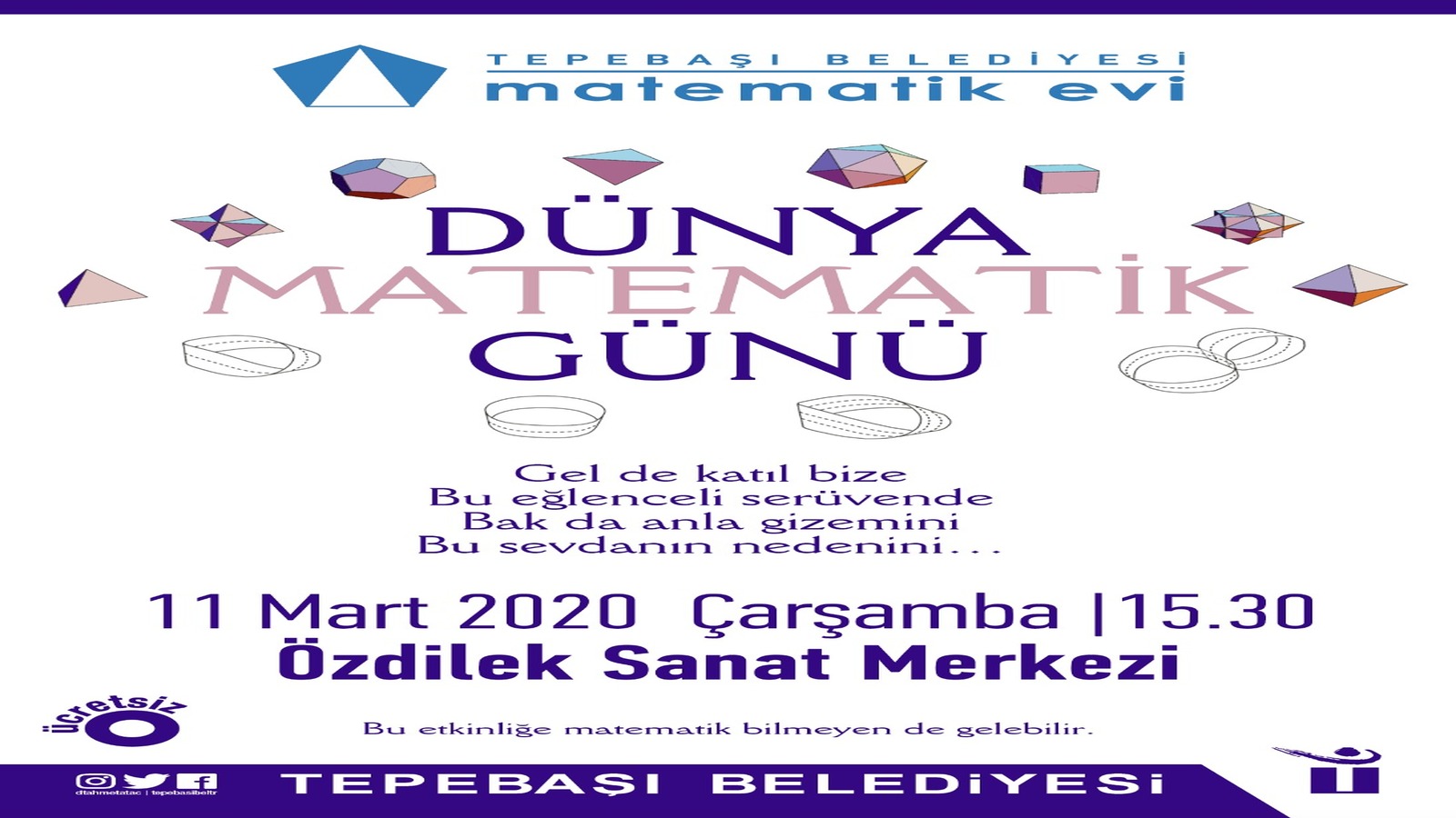 Matematik Evi yetkilileri, matematik bilgi seviyesi gözetmeksizin her vatandaşın etkinliğe katılabileceğini belirterek tüm Eskişehirlileri 11 Mart Çarşamba günü saat 15.30’da Özdilek Sanat Merkezi’nde düzenlenecek programa davet etti.