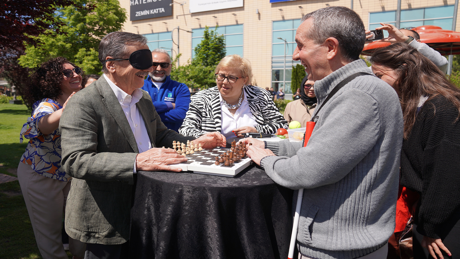 Sergi açılışının ardından Atilla Özel Karikatürlü Ev yanında hazırlanan Empati Parkurunu ziyaret eden Başkan Ataç, gözleri kapalı bir şekilde görme engelli birey ile satranç oynadı.