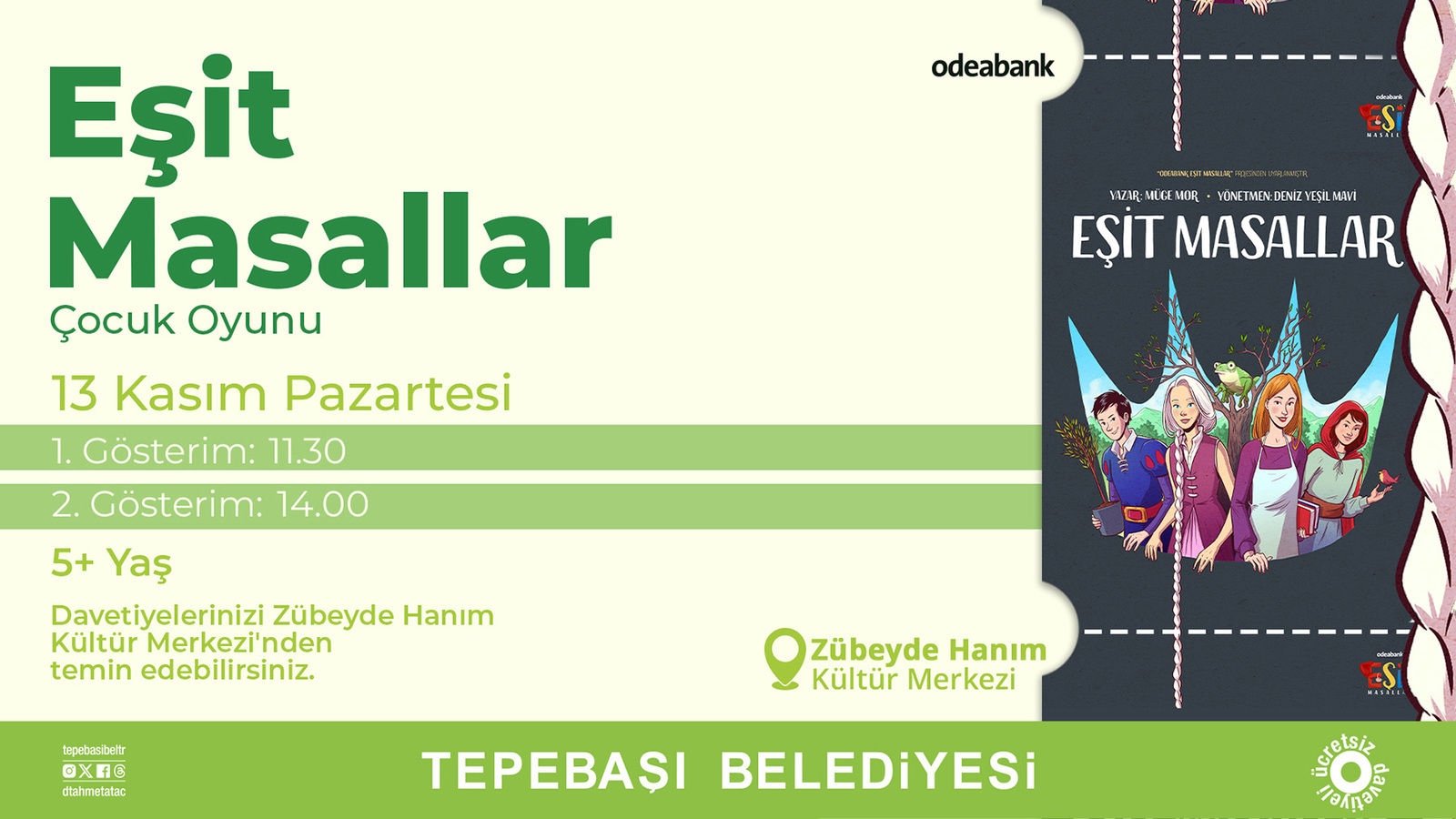 Bu kapsamda Odeabank tarafından geliştirilen ve kadın-erkek eşitliği bakış açısıyla yeniden yorumlanan masallardan uyarlanan “Eşit Masallar” tiyatro oyunu Eskişehirli çocuklar ve tiyatro severlerle buluşacak. Zübeyde Hanım Kültür Merkezi’nde 13 Kasım Pazartesi günü 2 gösterim şeklinde gerçekleşecek oyuna 5 yaş ve üzeri çocuklar katılabiliyor. İlk gösterim saat 11.30’da, ikinci gösterim ise saat 14.00’te gerçekleşecek. Çocuklara ara tatil hediyesi olarak sunulacak ve ücretsiz davetiyeli olan gösterim için biletler Zübeyde Hanım Kültür Merkezi’nden temin edilebilecek.