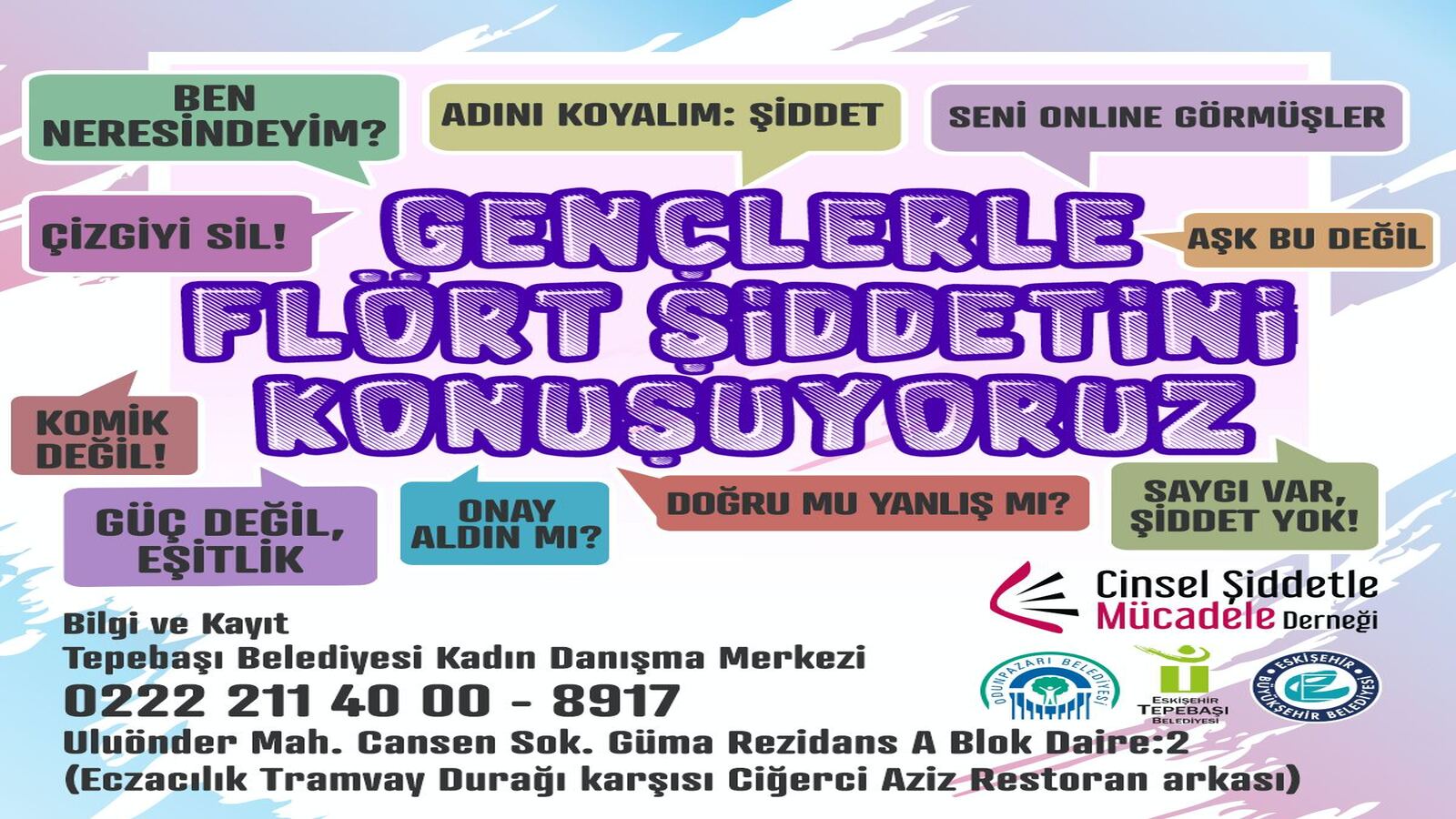 Tepebaşı Belediyesi Tepebaşı Belediyesi, Büyükşehir Belediyesi, Odunpazarı Belediyesi ve Cinsel Şiddetle Mücadele Derneği iş birliği ile ‘Gençlerle Flört Şiddetini Konuşuyoruz’ başlıklı farkındalık eğitimi verilecek. Flört şiddeti ve güvenli ilişkiler, toplumsal cinsiyet temelli şiddet, ayrımcılık, akran zorbalığı, sanal şiddet gibi birçok konuda atölyeler düzenlenecek.