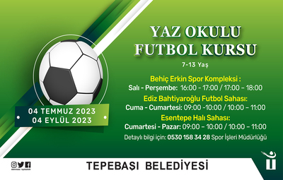 Bu kapsamda gerçekleştirilen Futbol Yaz Okulu için kayıtlar başladı. 7-13 yaş arası çocukların ücretsiz olarak kayıt olabileceği yaz okulu programı, Behiç Erkin Spor Kompleksi, Esentepe Halı Sahası ve Ediz Bahtiyaroğlu Futbol Sahası’nda gerçekleştirilecek. Kayıtlar ise ismi geçen merkezlere yaptırılabiliyor.