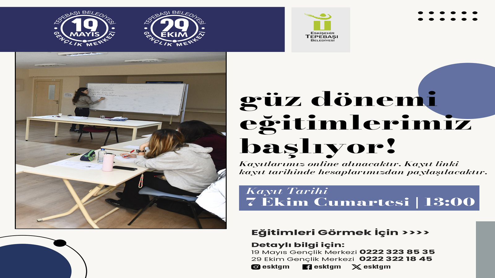 Tepebaşı Belediyesi’nin 2 farklı noktada hizmet veren Gençlik Merkezleri’nde, güz dönemi eğitimleri başlıyor. Ücretsiz olacak 30 farklı branştaki eğitimler için kayıtlar, online olarak 7 Ekim Cumartesi günü saat 13.00’te gerçekleştirilecek.