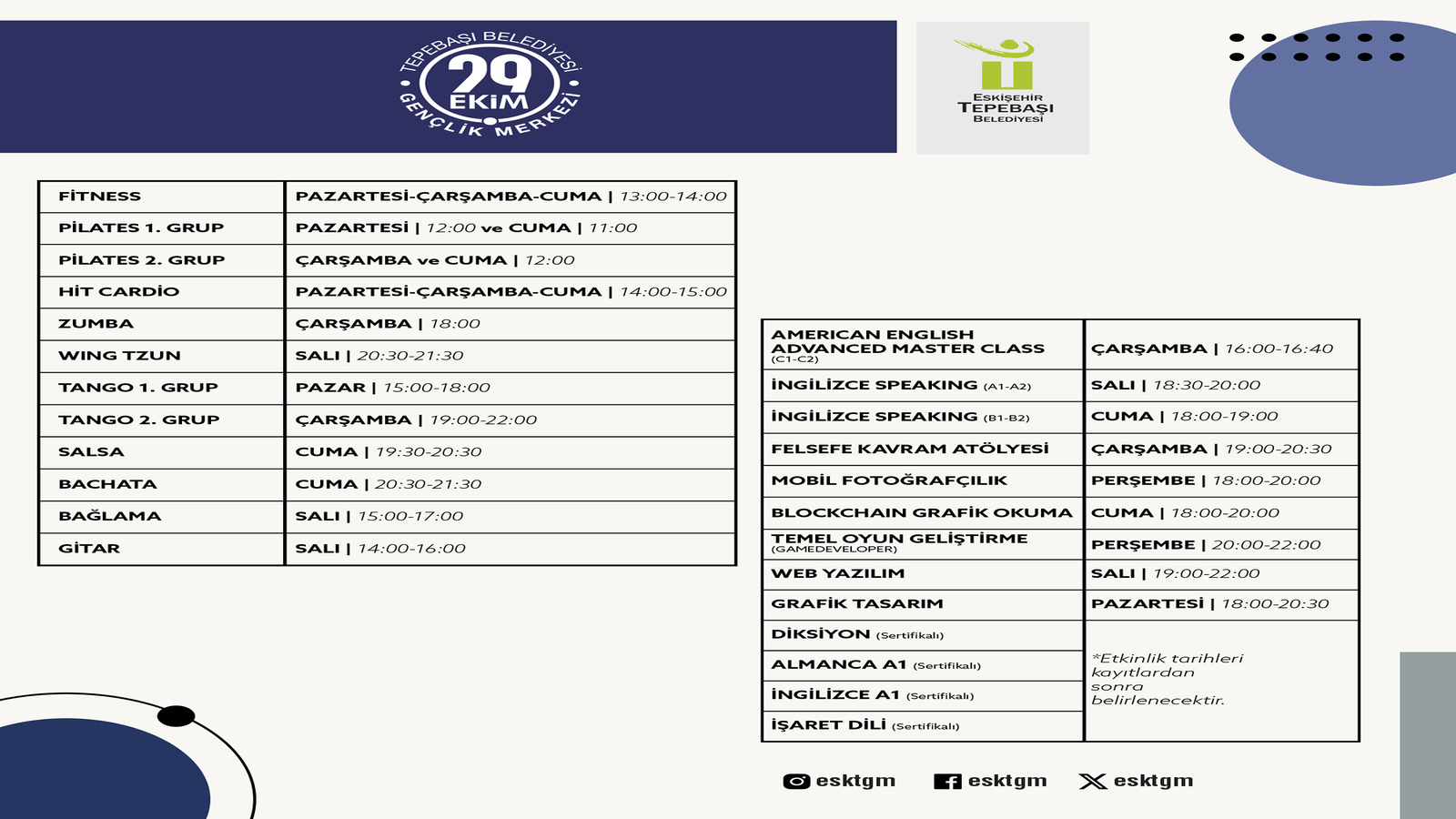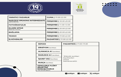 19 Mayıs Gençlik Merkezi ve 29 Ekim Gençlik Merkezi’nde gerçekleşecek eğitimler arasında; yaratıcı yazarlık, İngilizce speaking intermediate, fotoğrafçılık, klasik gitar, bağlama, tango, iş güvenliği, keman, diksiyon, Almanca A1, İngilizce A1, işaret dili, Rusça, fitness, pilates, hit cardio, zumba, wing tzun, salsa, bachata, gitar, American English Advanced Master Class (C1-C2), İngilizce speaking (A1, A2, B1, B2), felsefe kavram atölyesi, mobil fotoğrafçılık, blockhain grafik okuma, temel oyun geliştirme, web yazılım ve grafik tasarım yer alıyor.