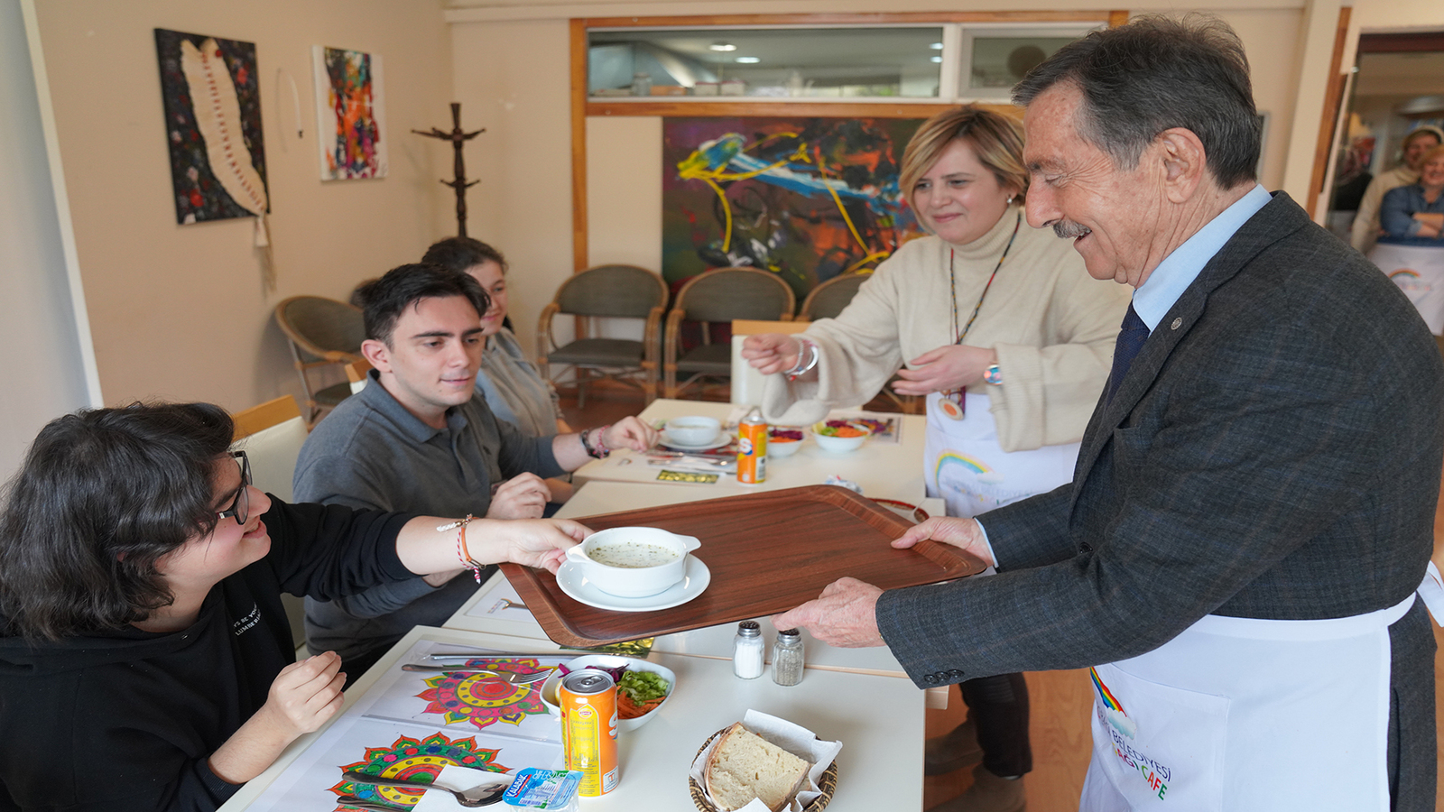 Her gün onlarca misafiri ağırlayan Gökkuşağı Kafe’nin bu defaki misafirleri özel bireyler oldu. 21 Mart Down Sendromlular Günü dolayısıyla Tepebaşı Belediye Başkanı Dt. Ahmet Ataç, Tepebaşı Belediyesi bünyesindeki merkezlerde eğitim alan özel bireylerle bir araya geldi. Gerçekleşen buluşmada Başkan Ataç, özel bireylerle keyifli bir sohbet gerçekleştirdi. Sohbetin ardından ise Başkan Ataç ve beraberindekiler, Gökkuşağı Kafe’nin özel misafirlerine yemek servisi yaptı.