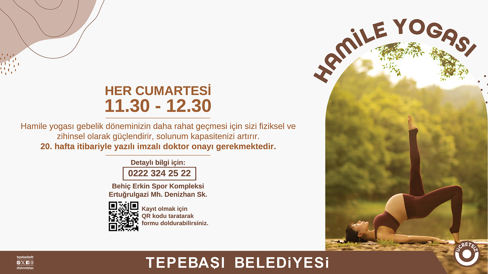 Bu kapsamda gerçekleştirilecek hamile yogası programı için kayıtlar başladı. Her cumartesi gerçekleştirilecek hamile yogası eğitimleri Behiç Erkin Halı Sahası Çok Amaçlı Salon’da düzenlenecek. Gebelik döneminin rahat geçirilmesi için fiziksel ve zihinsel olarak güçlendiren ve solunum kapasitesini artırması ile bilinen hamile yogası eğitimleri, uzman eğitmenler gözetiminde gerçekleştirilecek. Tepebaşı Belediyesi yetkilileri hamile yogasına katılacak anne adaylarının 20. hafta itibariyle imzalı doktor onayı gerektiğini duyurdu.
