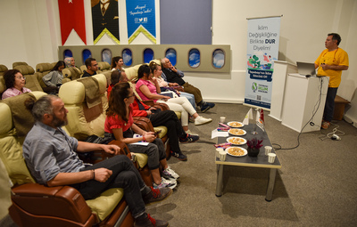 Vecihi Hürkuş Havacılık ve Teknoloji Parkı’nda gerçekleştirilen ‘İklim İletişim Atölyesi’nde Anadolu Üniversitesi İletişim Fakültesi Öğretim Üyesi Prof. Dr. Nezih Orhon tarafından iklim sözcülerine, ‘İklim iletişimi, iklimi anlamak ve iklimle yüzleşmek’ konulu sunumu gerçekleştirildi. Sunumun ardından atölyeye katılan iklim sözcülerinin karbon ayak izi hesaplatıldı.