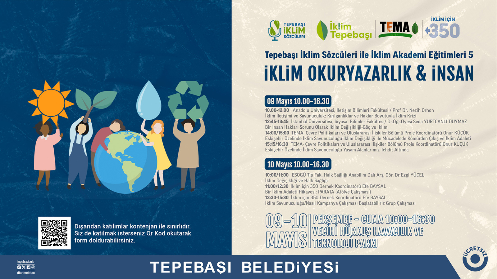 Eğitim, 9 Mayıs Perşembe günü ve 10 Mayıs Cuma günü 10.00-16.30 saatleri arasında Tepebaşı Belediyesi Vecihi Hürkuş Havacılık ve Teknoloji Parkı’nda gerçekleştirilecek. Öte yandan yetkililer, dışarıdan katılımların kontenjan ile sınırlı olduğunu belirterek, eğitime katılmak isteyenlerin ise afişte yer alan QR Kodu okutarak veya https://tinyurl.com/iklimakademi5 linki üzerinden başvuru formuna ulaşabileceklerini bildirdi.