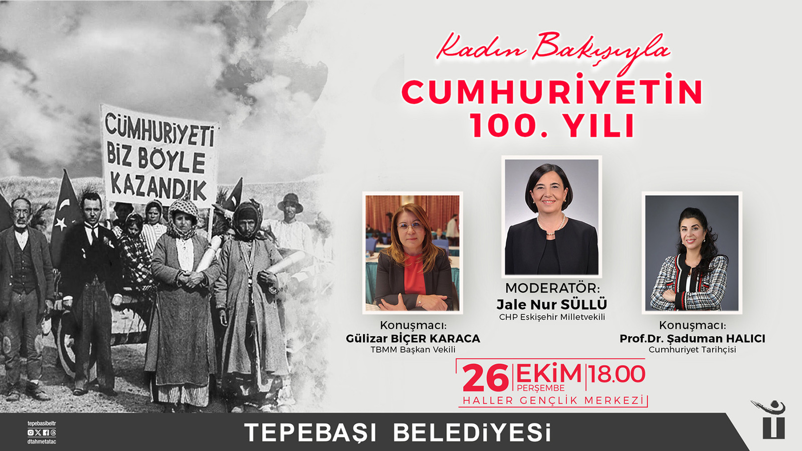 Bu kapsamda ‘Kadın Bakışıyla Cumhuriyetin 100. Yılı paneli, Eskişehirliler ile buluşacak. Haller Gençlik Merkezi’nde gerçekleşecek ve Moderatörlüğünü CHP Eskişehir Milletvekili Dr. Jale Nur Süllü’nün yapacağı panele TBMM Başkan Vekili Av. Gülizar Biçer Karaca ve Cumhuriyet Tarihçisi Prof. Dr. Şaduman Halıcı konuşmacı olarak katılacak. 26 Ekim Perşembe günü saat 18.00’de düzenlenecek panele tüm Eskişehirliler davet edildi.