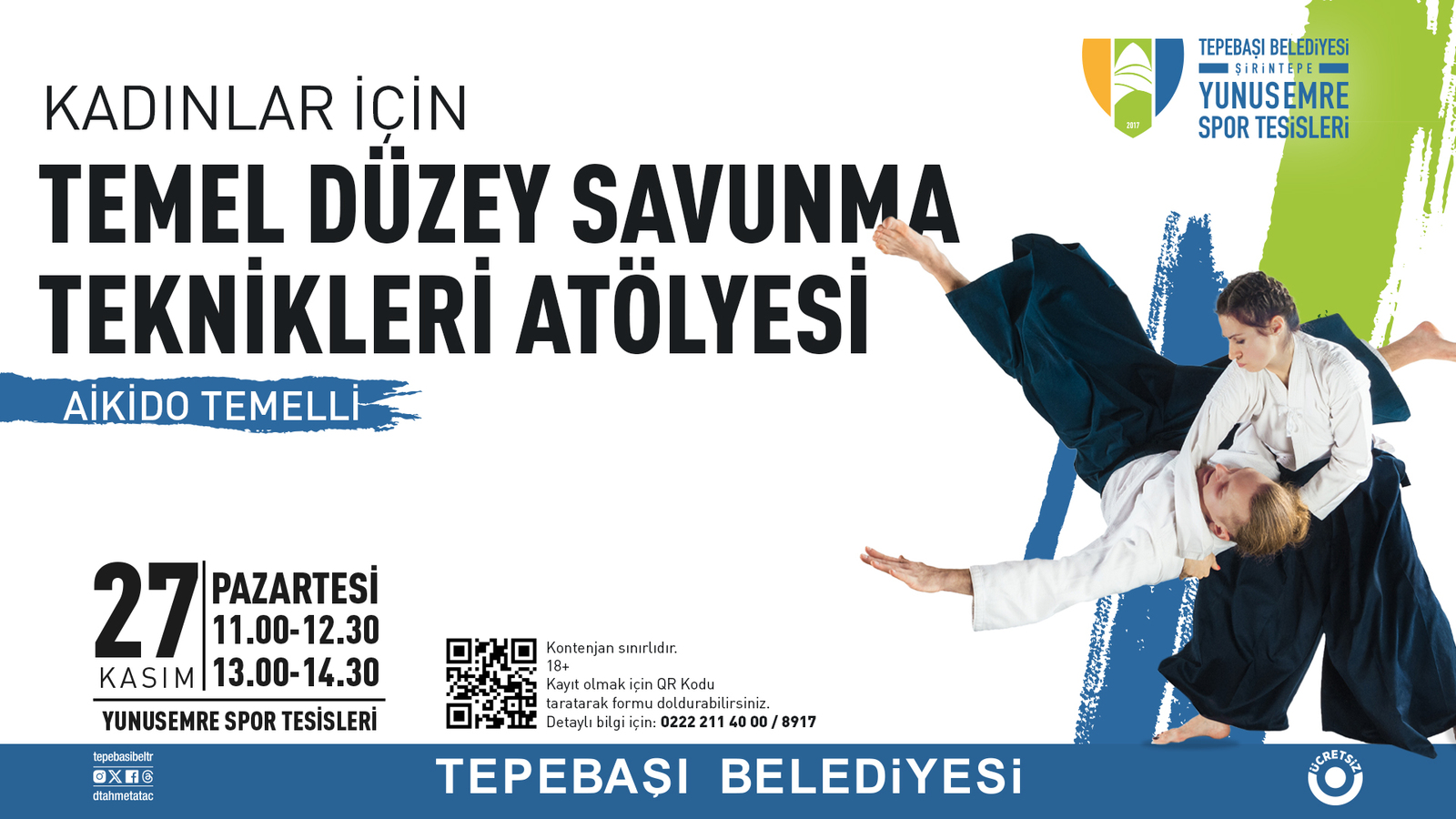 27 Kasım Pazartesi günü saat 11.00-12.30 ila 13.00-14.30 arasında gerçekleşecek olan atölyeye 18 yaş ve üzeri kadınlar katılabiliyor. Kontenjanın sınırlı olduğu atölyeye katılmak isteyenler duyuru görselinde bulunan QR kodu okutarak veya https://tinyurl.com/aikidotep linkine tıklayarak kayıt formunu doldurabiliyor.