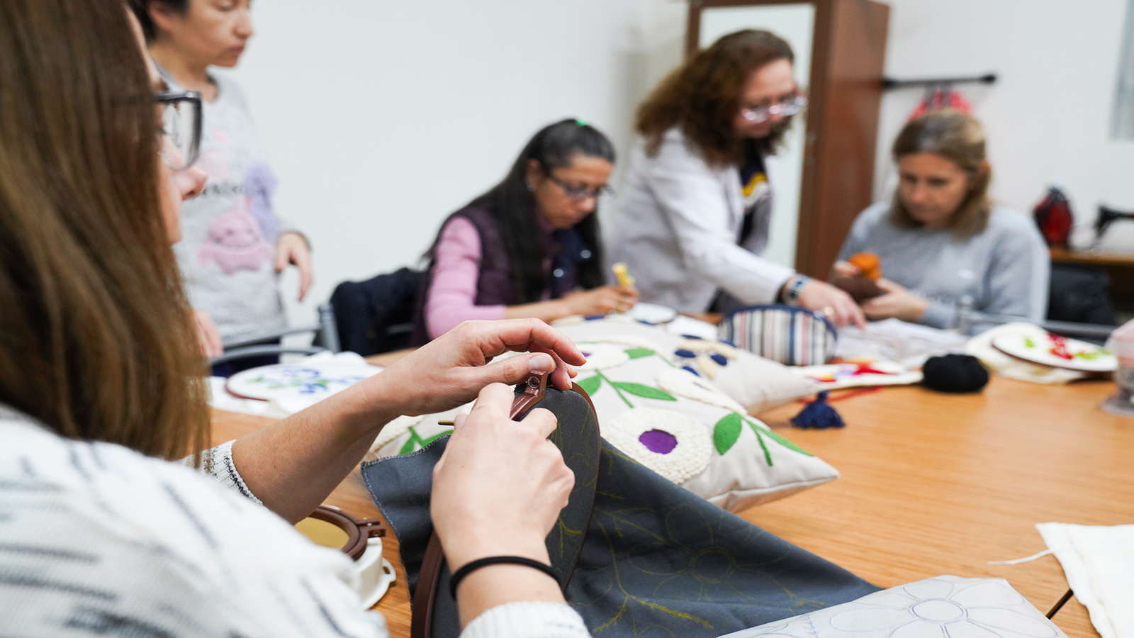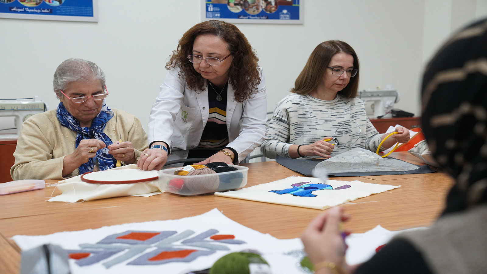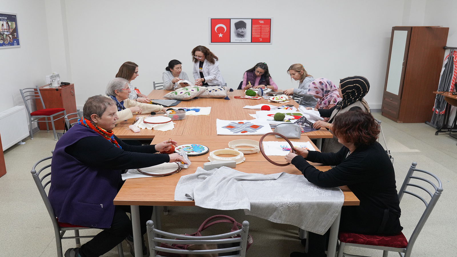 Tepebaşı Belediyesi Yeşiltepe Belde Evi kursiyeri kadınlar, katıldıkları punch kursunda kumaşa üç boyutlu figürler işlemeyi öğreniyor.
