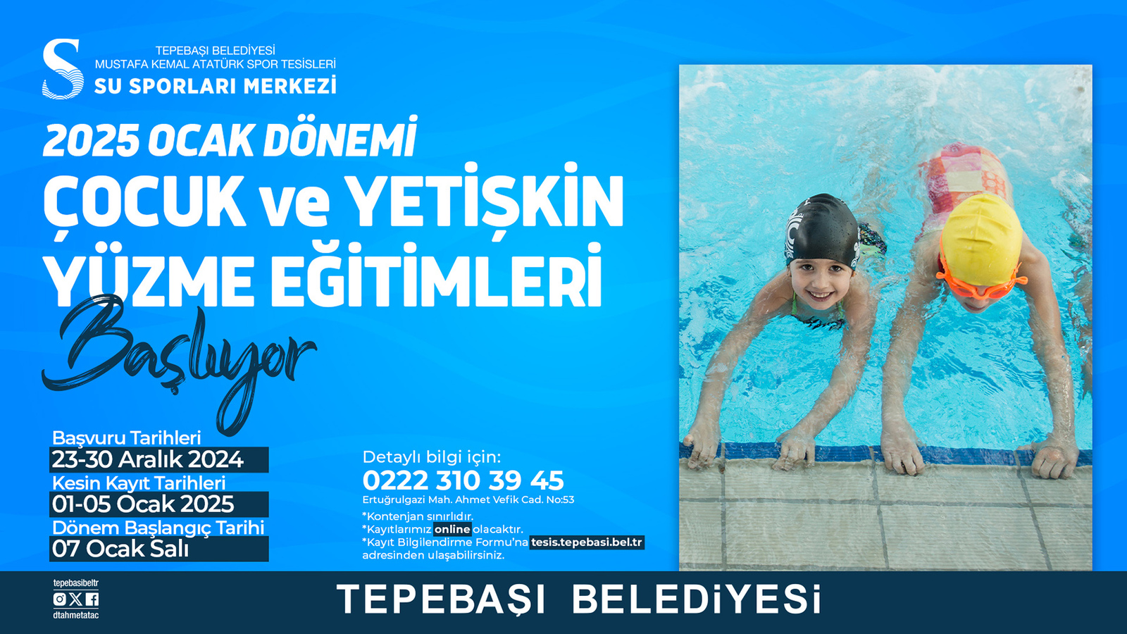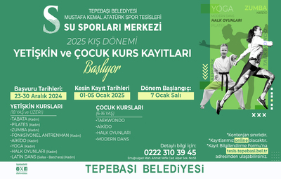 Mustafa Kemal Atatürk Spor Tesisleri Su Sporları Merkezi kış dönemi kurs programlarına başvurular, https://tesis.tepebasi.bel.tr/ adresinden ulaşılan formun doldurulması ile yapılıyor. Konu hakkında detaylı bilgi almak isteyen vatandaşlar, 0 (222) 310 39 45 numaralı telefondan yetkililere ulaşabiliyor.